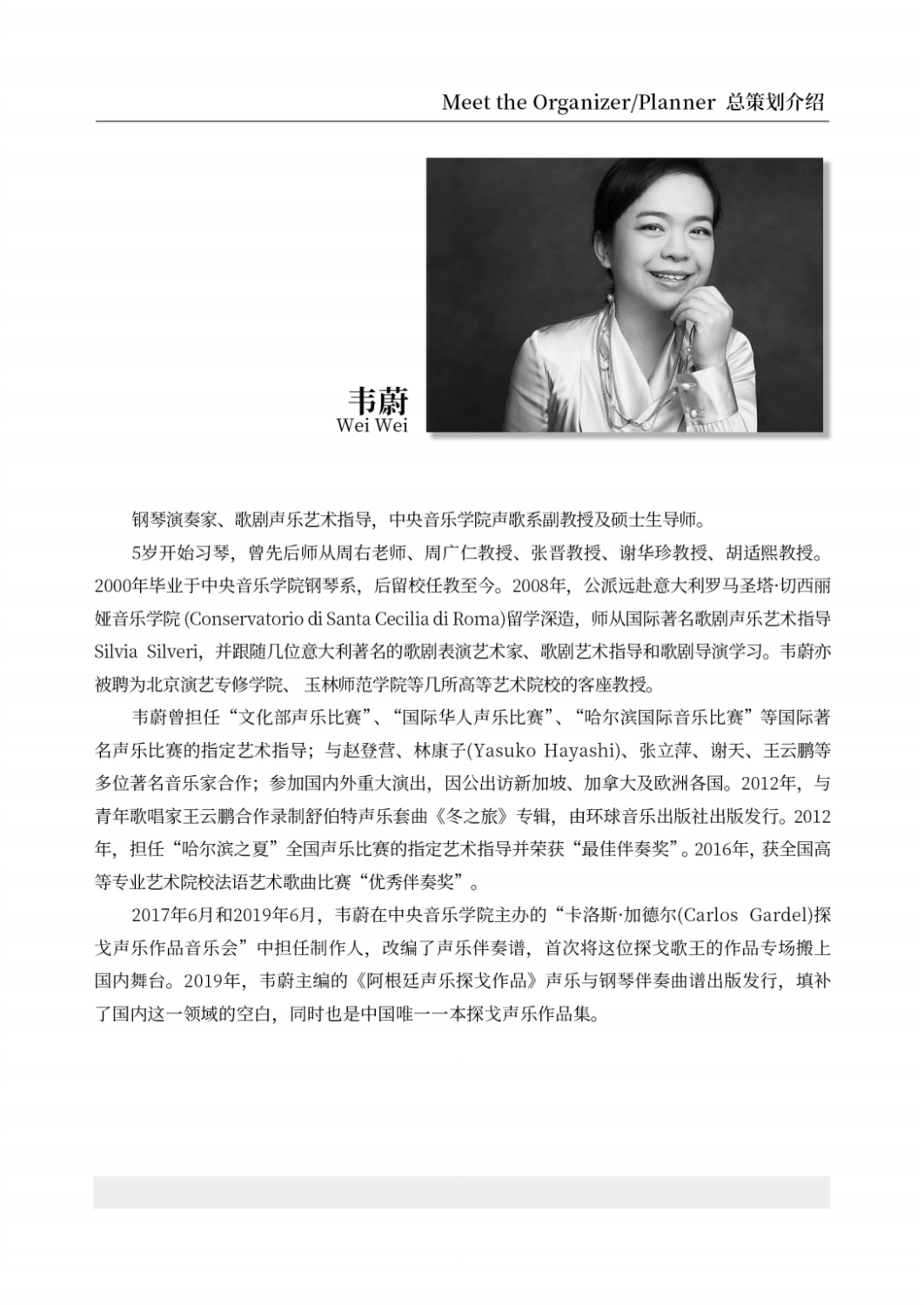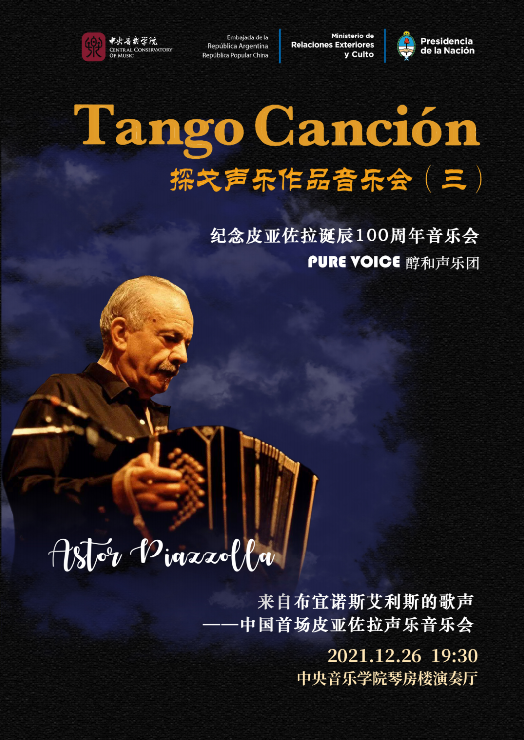 作为探戈艺术研究与实践中心成立以来举办的第一场大型活动,本场音乐会将在表演中深化对探戈音乐的理解,为今后的研究和实践拉开序幕!展现在中国还不为人知的皮亚佐拉声乐作品,让更多人了解并喜爱探戈声乐,从而加强中阿音乐文化交流。