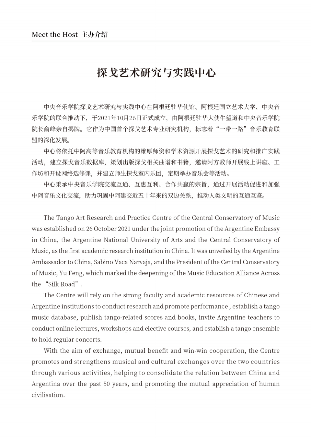 音乐会的主办方——开云kaiyun官方网站探戈艺术研究与实践中心,于2021年10月26日正式成立,是中国首个探戈艺术专业研究机构,得到了阿根廷驻华使馆、阿根廷国立艺术学院的支持。中心旨在通过开展探戈艺术的研究和推广实践活动,促进和加强中阿音乐文化交流和探戈艺术的发展,助力巩固中阿建交近五十年来的双边关系。