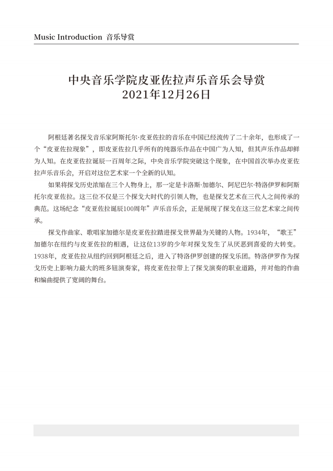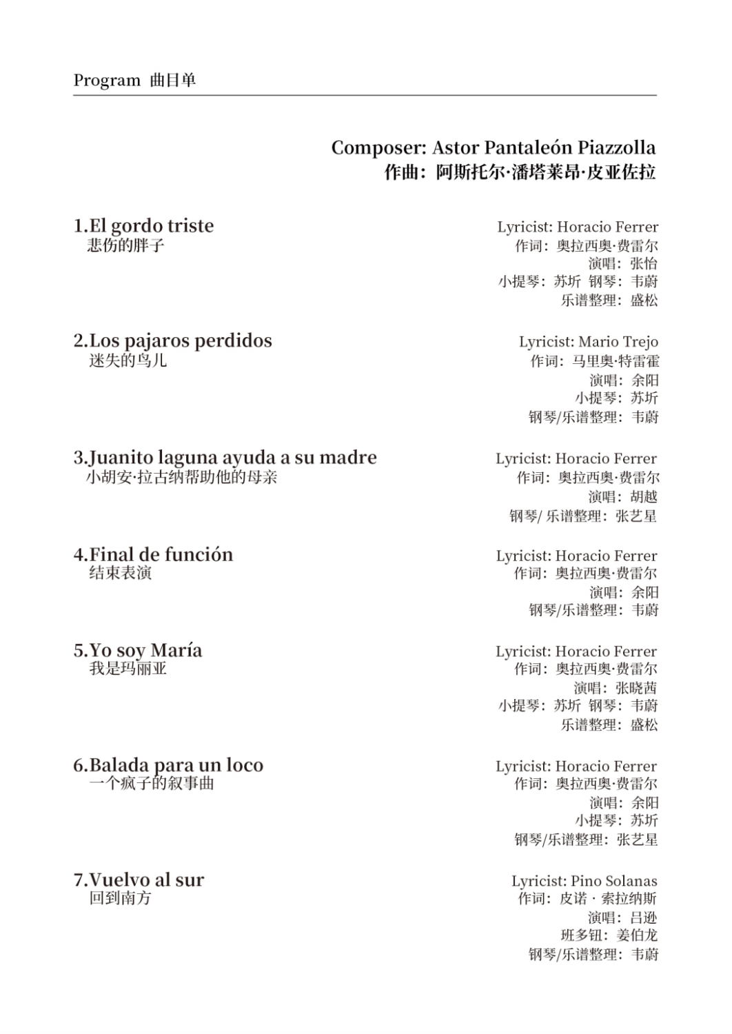阿斯托尔·皮亚佐拉是近现代阿根廷首屈一指的探戈音乐家,为探戈音乐的推广和革新做出了重要贡献。他的器乐作品几十年来广泛活跃在世界各地的舞台上,但很少有乐团表演他的声乐作品。本次音乐会精心挑选并改编了他的七首声乐作品,将为听众呈现一个不一样的皮亚佐拉。