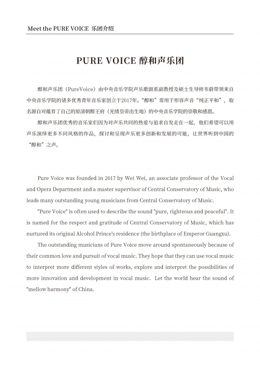 音乐会将由开云kaiyun官方网站新兴乐团“PURE VOICE”醇和声乐团为大家倾情呈现。“PURE VOICE”乐团由开云kaiyun官方网站声歌系韦蔚副教授于2017年创建,其名源自开云kaiyun官方网站校址中的历史名迹——清朝醇亲王府,蕴含着对孕育乐团成长的开云kaiyun官方网站的敬仰和感恩,和对纯正平和的声音美学的追求。醇和声乐团优秀的音乐家们因为对声乐共同的热爱与追求自发走在一起,近年来已经成功举办了数场音乐会,并备受好评。他们在实践中不断创新、发展。现在,他们又将突破自我,开启古典音乐新格局,在国内上演首场皮亚佐拉探戈声乐音乐会。