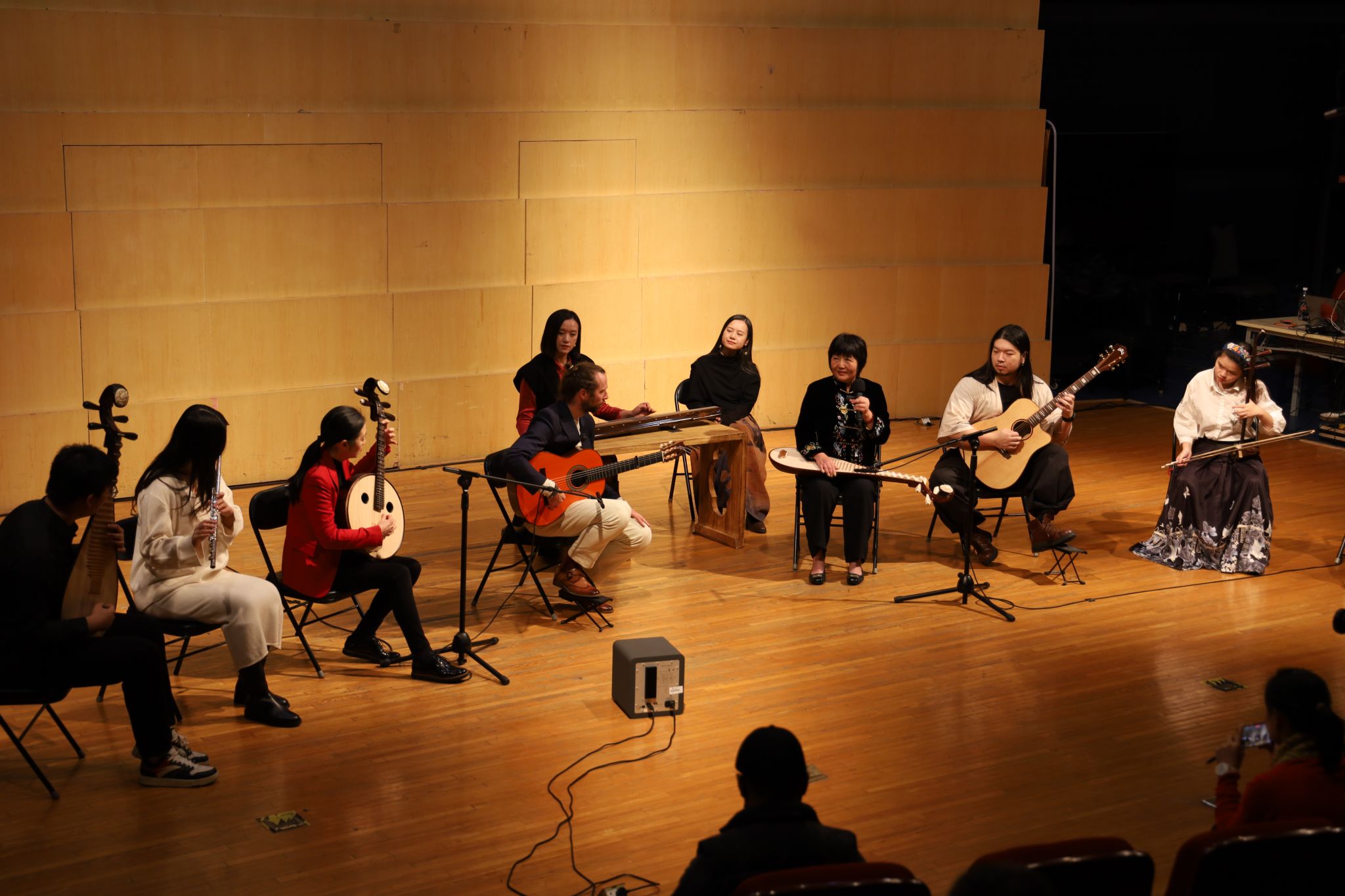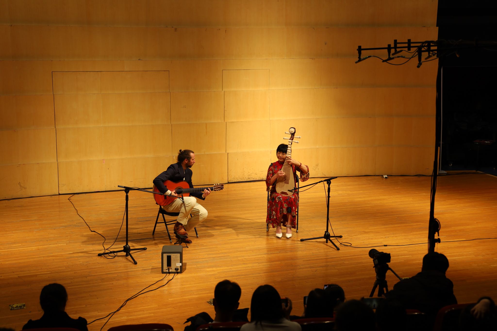 讲座中,旅美琵琶演奏家、美国卡尔顿大学高虹教授联合阿根廷弗拉明戈吉他演奏家、音乐制作人伊格纳西奥·卢萨迪·蒙特维多(Ignacio Lusardi Monteverde)向观众介绍了弗拉明戈音乐旋律与节奏的复杂性与表现力,以及中国琵琶与弗拉明戈吉他的即兴合作特点及原则。在互动环节中,现场师生怀抱乐器走上舞台,体验中国民族乐器与弗拉明戈吉他的即兴演奏接龙,在互相配合下共同完成了即兴演奏,现场效果活跃热烈。