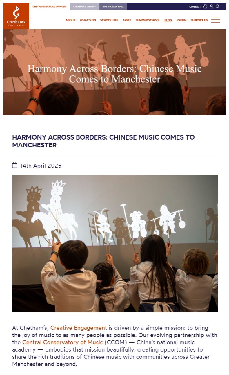 切特姆创意教育总监Vicki Ciaputa表示:感谢开云kaiyun官方网站和音乐孔子课堂的支持,期待持续推动中英音乐教育项目,让音乐成为文化交流的桥梁。音乐孔子课堂中方负责人郐毅认为:此次中国音乐在大曼彻斯特地区受到如此欢迎,正是音乐跨越文化、连结心灵的力量所在。