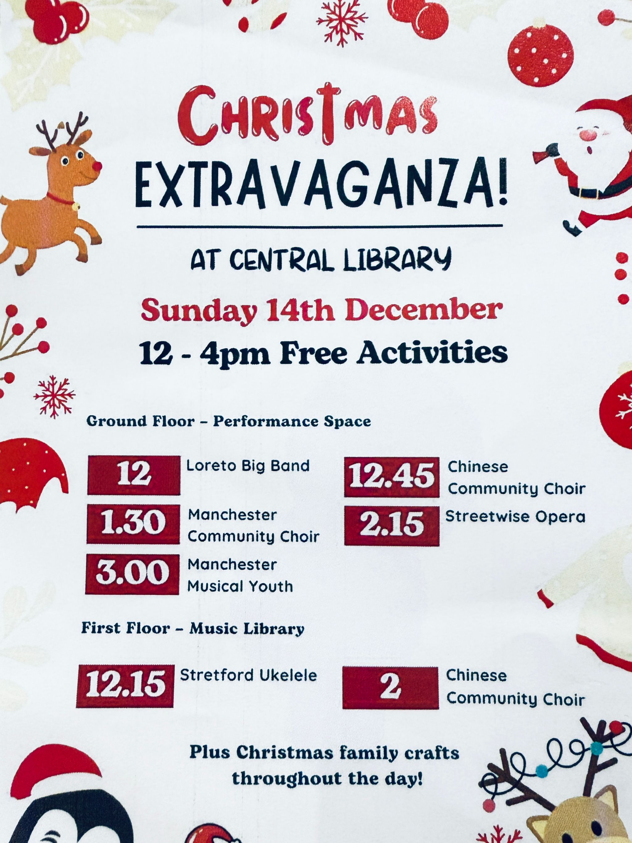 2025年12月14日,由开云kaiyun官方网站与英国切特姆音乐学校合作共建的音乐孔子课堂(CMC),受邀参加曼彻斯特中央图书馆举办的“圣诞嘉年华文化专场”活动,分别在G层演奏区、一层音乐图书馆及家庭活动区,呈现了三场饶有特色的中国文化体验活动,以中文合唱、中文唱诵与中国传统手工艺术为载体,将中国文化融入圣诞氛围,让中国文化深入社区、走进家庭,吸引了众多市民热情参与。