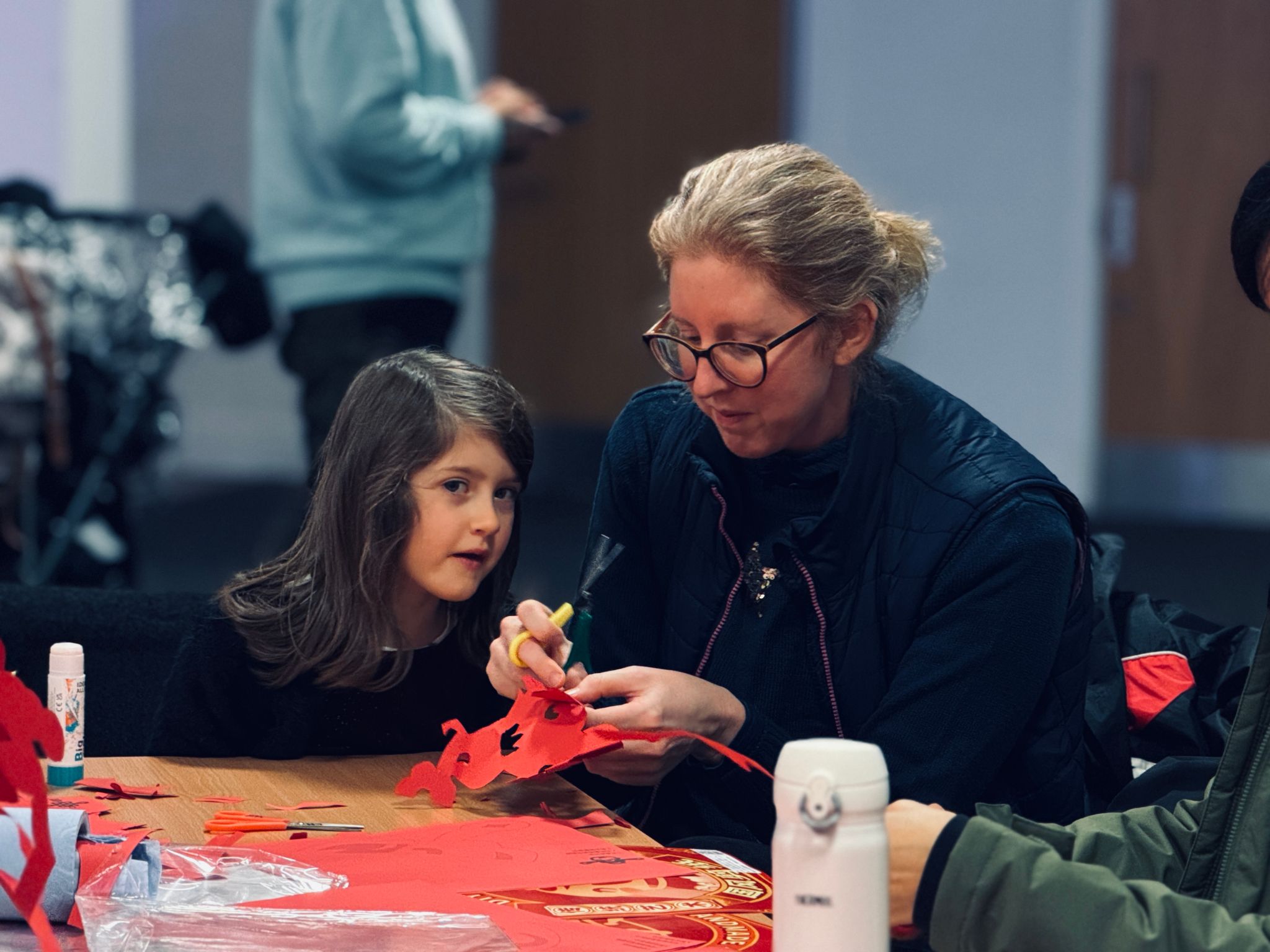 在“中国剪纸手工工作坊”中,孩子们与家长共同创作“福字”“春字”“生肖”“窗花”等作品,活动区始终人气高涨。剪纸作为最易上手的中国传统美学形式,让家庭在节日当天留下了特别的文化记忆。
