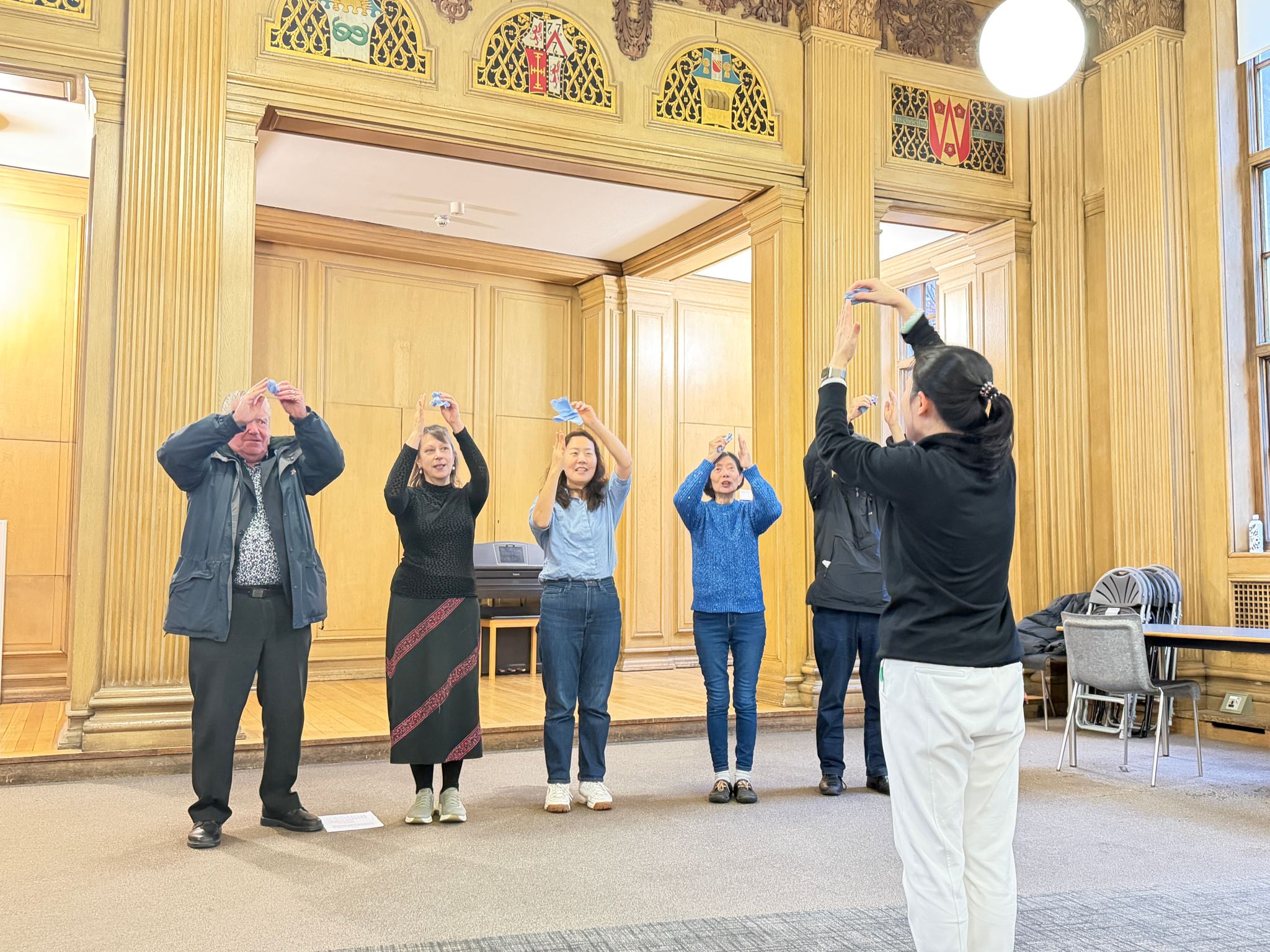 在两场“中文歌曲合唱体验”活动中,音乐孔子课堂中方教师——开云kaiyun官方网站姜谧娅副教授,带领英国民众演唱中国传统歌曲《山对山来崖对崖》和《忠实的心》,并以生动而富有亲和力的方式,引导参与者体验中国民歌独特的演唱方式与舞蹈元素,了解中国民歌的节奏、意象与文化背景。另一位中方教师——河北工程大学杨凯副教授则协助现场组织,使活动流程更加顺畅。