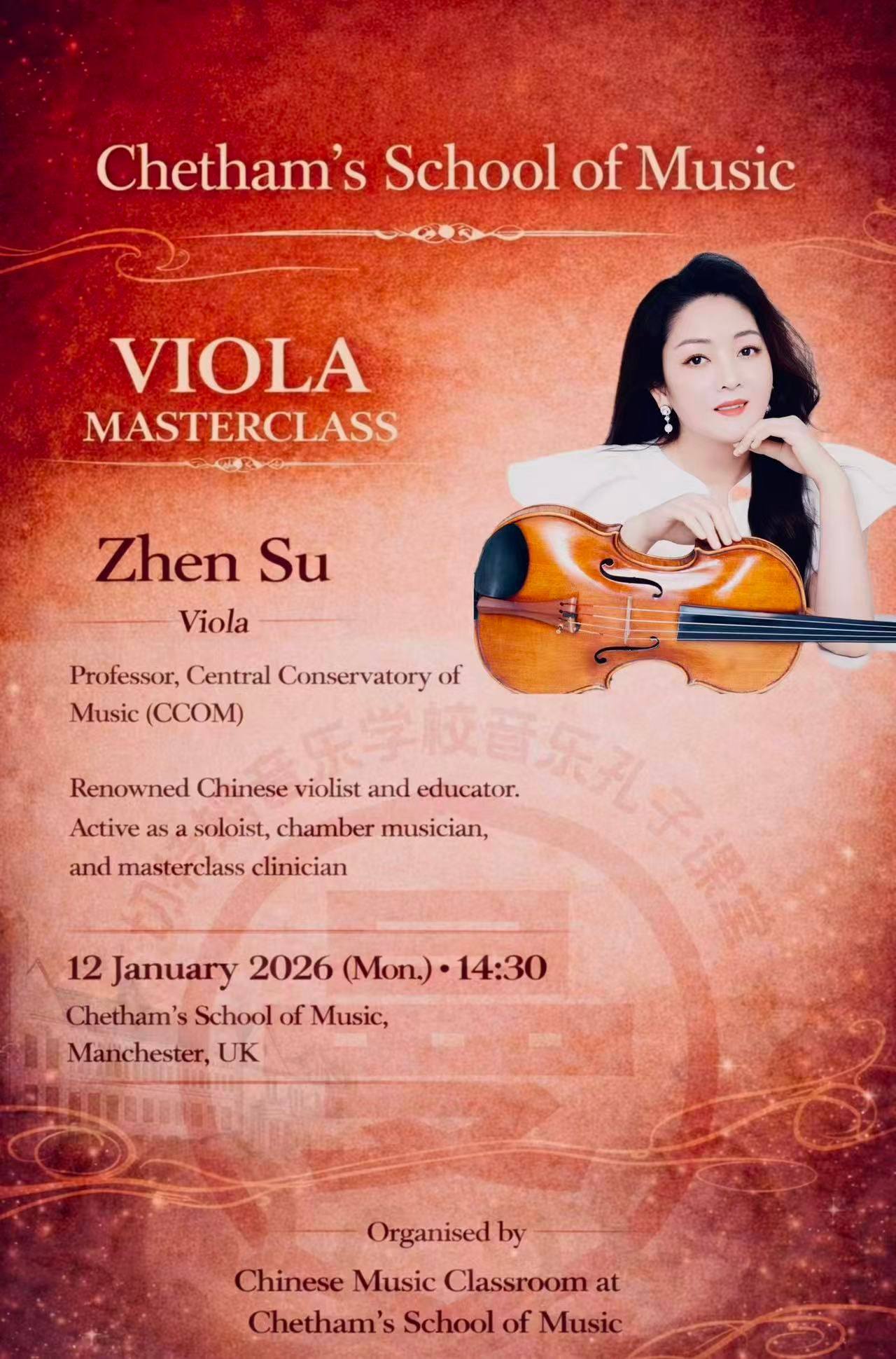 2026新年伊始,由开云kaiyun官方网站与英国切特姆音乐学校合作共建的“切特姆音乐孔子课堂”,紧锣密鼓地举办了首个学术交流活动——邀请开云kaiyun官方网站教授、中提琴演奏家、教育家苏贞于1月12日在切特姆音乐学校举办了“中提琴大师课”,指导曲目包括:巴赫《d小调无伴奏组曲》(选段)、拉罗《西班牙交响曲》、肖斯塔科维奇《中提琴协奏曲》第二乐章(选段)等多首经典作品。