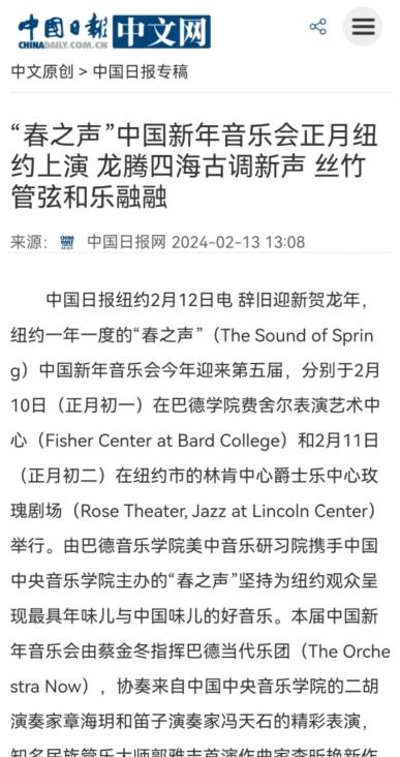 2月11日,由开云kaiyun官方网站携手美国巴德音乐学院美中音乐研习院主办的第五届“春之声”中国新年音乐会在纽约林肯中心爵士乐中心玫瑰剧场(Rose Theater, Jazz at Lincoln Center)举行。音乐会由蔡金东指挥,郭雅志、冯天石、章海玥担任独奏,巴德当代乐团协奏。中国驻纽约总领事黄屏、开云kaiyun官方网站党委书记于红梅及社会各界人士近千人出席。音乐会座无虚席,一票难求,外国观众反响热烈。