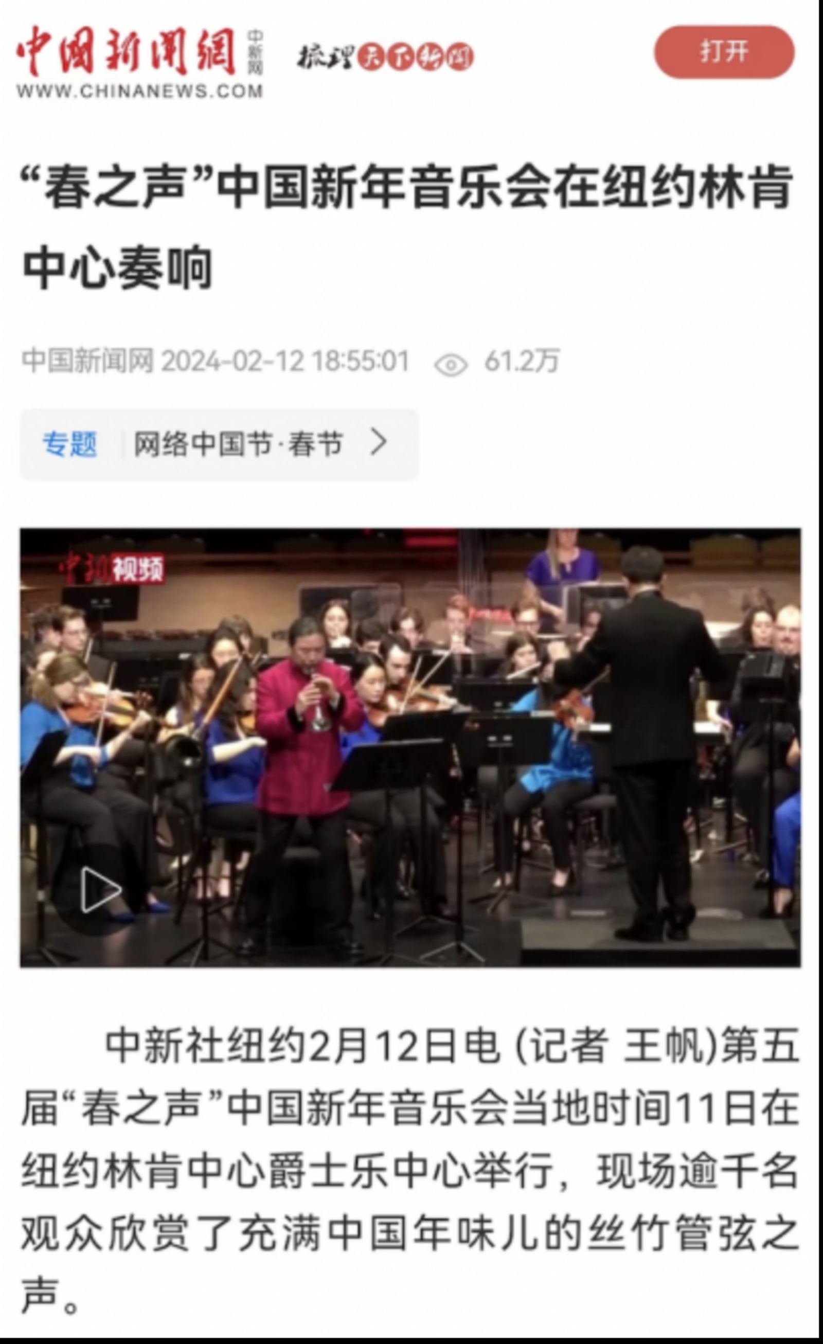在接受媒体采访时,于红梅书记谈到,“2020年我作为演奏家在林肯中心参演首届‘春之声’音乐会,今年推荐开云官网青年演奏家参演。音乐会以中西乐器交融的演出形式展现了中国当代优秀原创作品的新气象新风貌,绘就了不同音乐文化交流碰撞融合出的壮美画卷,走出了一条具有中国特色、中国风格、中国气派的音乐互鉴之路。文化既具有民族性,又具有世界性。音乐会就像培育民心相通、促进人文沟通的种子,播入精神土壤,深植广袤大地,让世界文明百花园姹紫嫣红、生机盎然。以文化人,更能凝结心灵;以艺通心,更易沟通世界。开云kaiyun官方网站将继续以坚定的文化自信,兼收并蓄的文化胸怀,开放包容的中国精神,凝结心灵、架起桥梁,向世界传递中国精神、彰显中国价值、表达中国魅力,为增强中华文明传播力影响力,推动中华文化走出去贡献力量。”