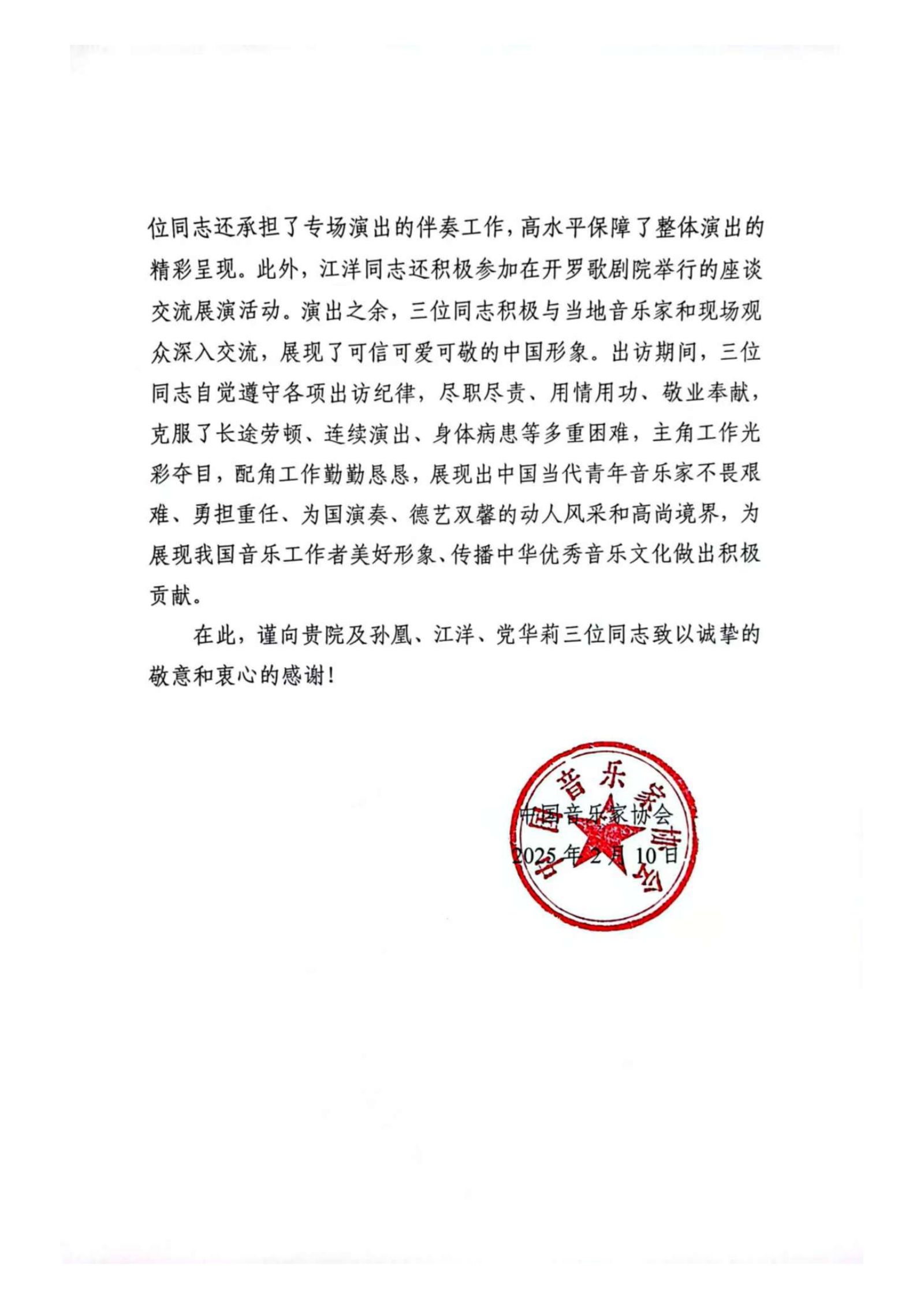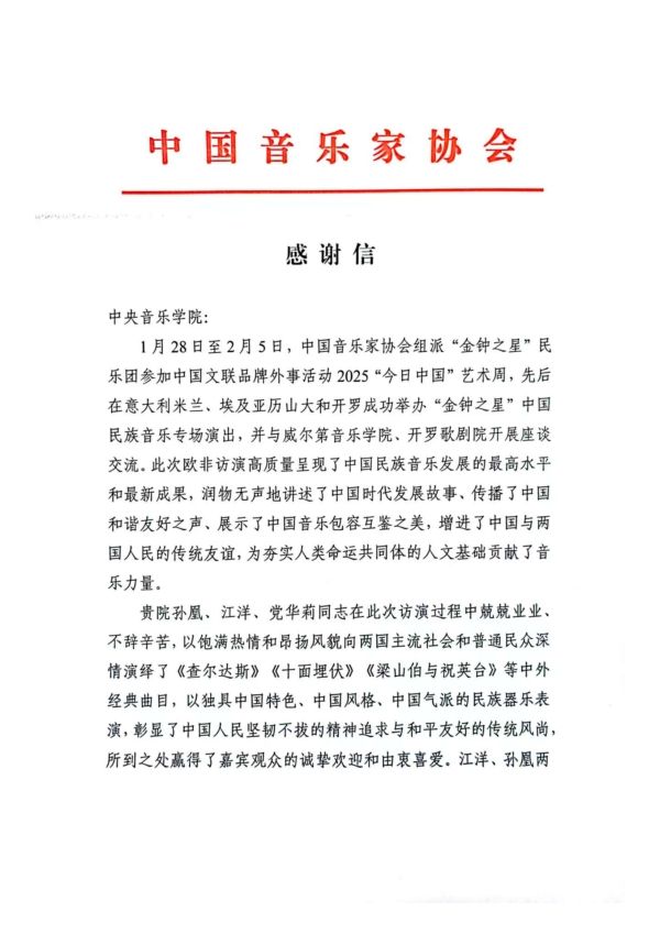 近日,开云官网收到中国音乐家协会发来的感谢信,对开云官网积极参与2025“今日中国”艺术周活动表示感谢,同时对三位老师在活动中的出色表现给予了高度评价。