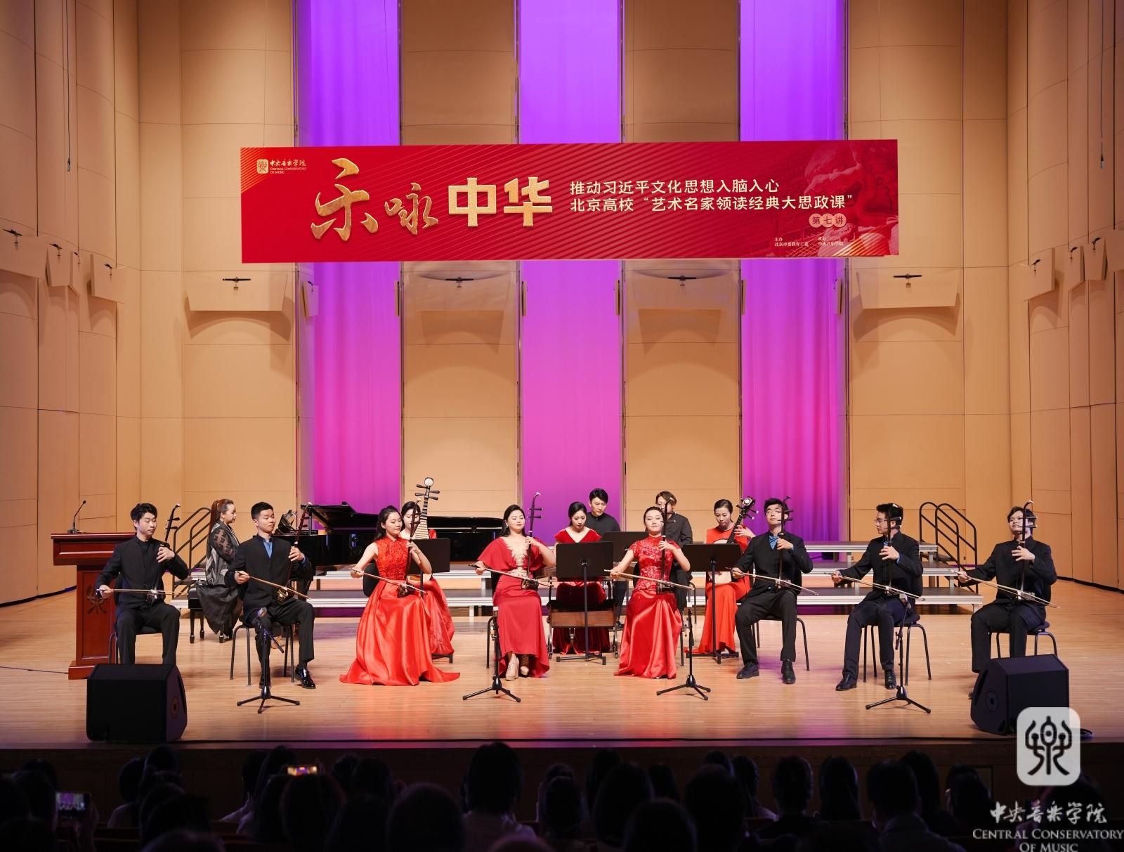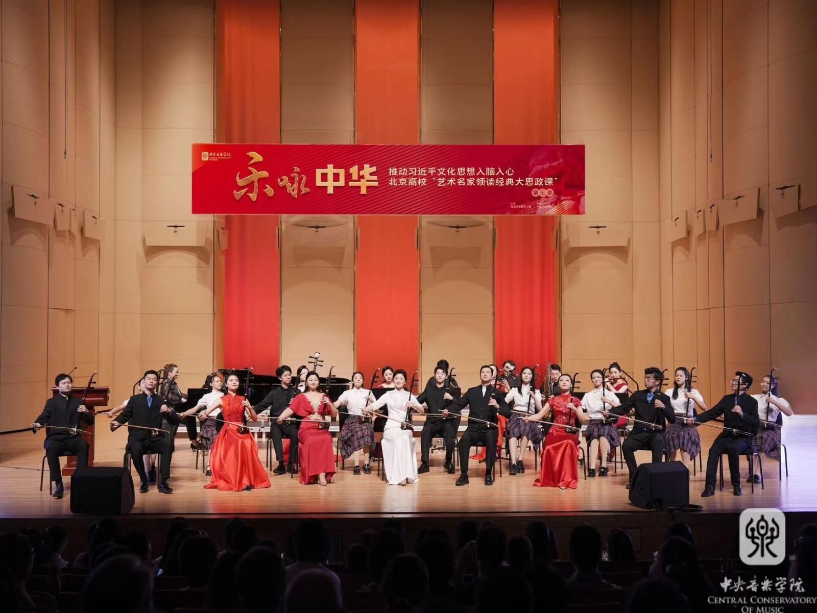 开云kaiyun官方网站党委书记、著名二胡演奏家、教育家于红梅教授紧紧围绕深入学习贯彻习近平文化思想,坚持“为人民服务、为社会主义服务”的根本方向,以“乐咏中华”为主题,采用讲演结合的方式,通过13首不同形式的音乐作品,围绕“筑牢文艺灵魂承载中国精神”“坚持‘两个结合’光大中华文脉”“坚守人民立场攀登文艺高峰”“秉持开放包容推动文明互鉴”“心怀‘国之大者’建设中华民族共有精神家园”五个方面,诠释了习近平文化思想的核心要义、精神实质、丰富内涵以及实践要求。