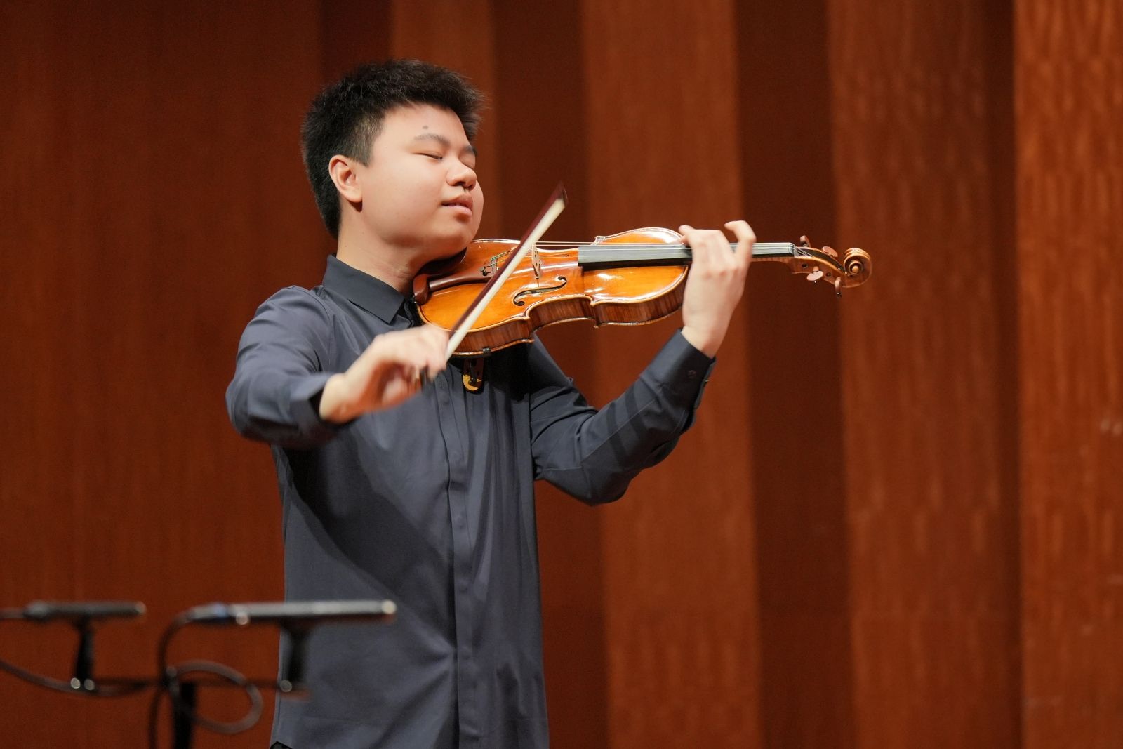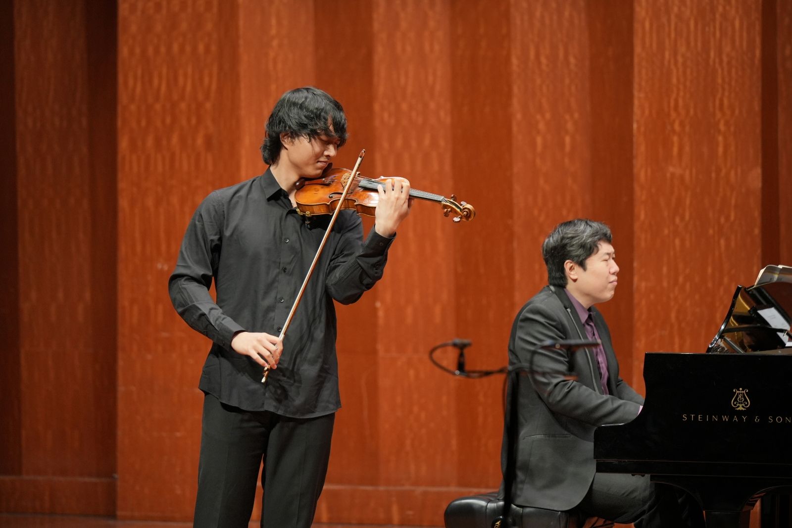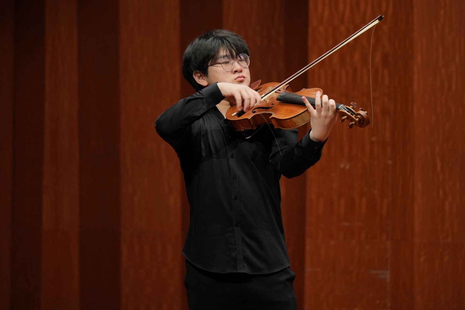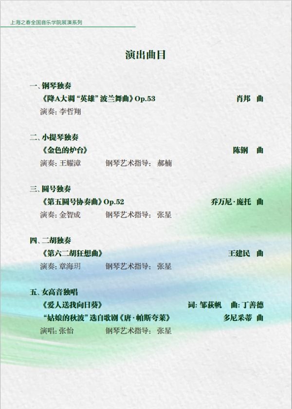 此次音乐会为现场观众呈现了十余首中外经典名作,包括肖邦《降A大调“英雄”波兰舞曲》、帕格尼尼《钟》、肖斯塔科维奇《五首双小提琴与钢琴小品》、陈钢《金色的炉台》、王建民《第六二胡狂想曲》等器乐作品,以及丁善德的艺术歌曲《爱人送我向日葵》和多尼采蒂歌剧选段《姑娘的秋波》,另外还有学生原创新作品古筝独奏《尘雾涅槃》。音乐会现场观众席上掌声雷动,叫好声不断。