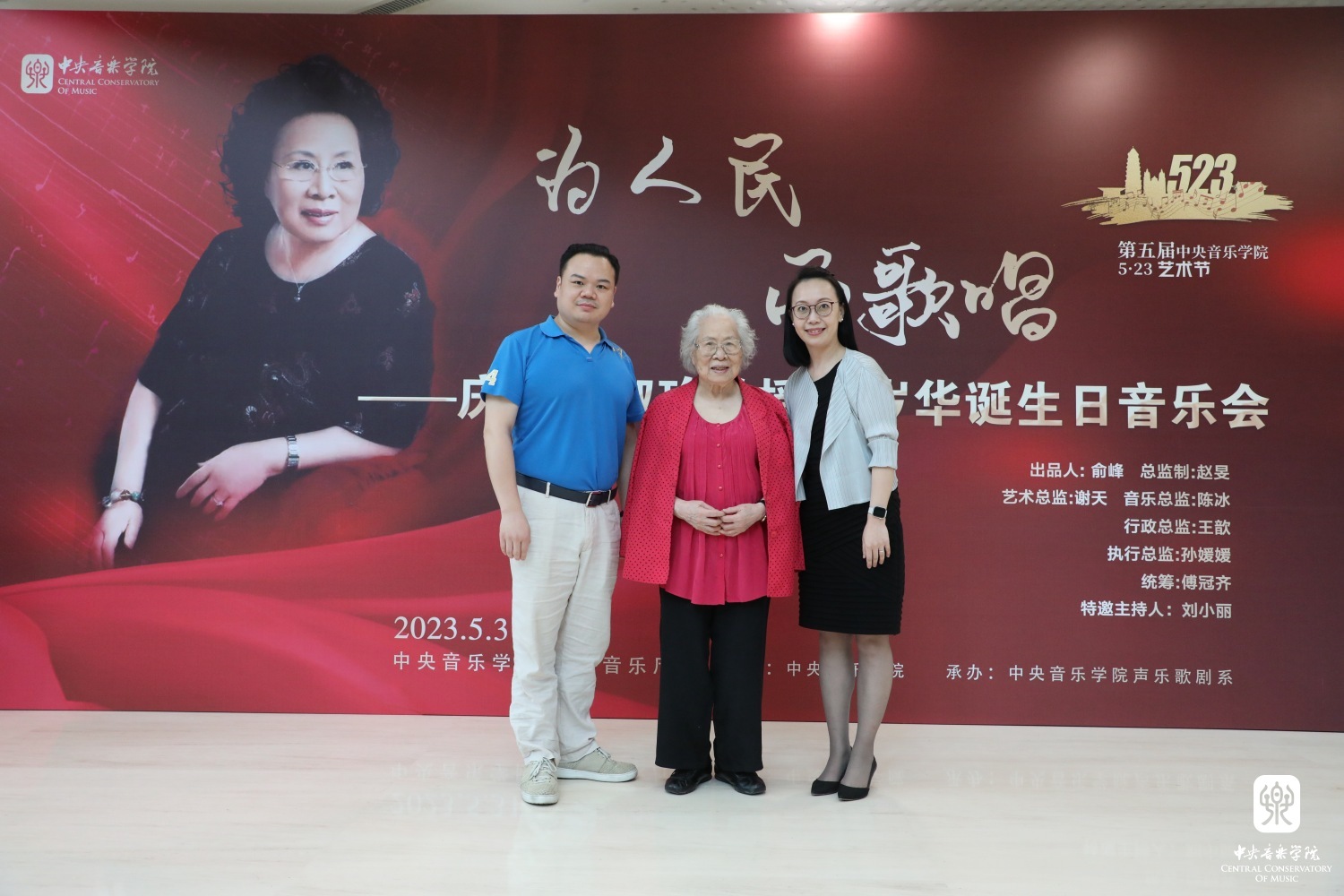 声乐歌剧系党总支书记陈冰(右)、声乐歌剧系主任谢天(左)与郭淑珍教授合影