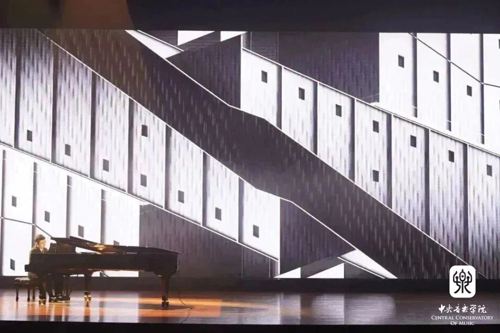 接下来,李小兵教授向观众介绍了亲临现场的本场音乐会AI技术总监管晓宏院士,以及他在音乐与幂律关系方面的研究成果,还有下一步将要和王小勤教授联合研究的目标。通过幂律的话题,引出了下一首作品——赵艺璇作曲的Drizzle Path(为机器听觉、AI生成视觉与钢琴而作)。其中声音部分采用了机器听觉技术,通过实时提取钢琴演奏家的演奏参数,包括音高、泛音、速度、响度等,利用随机算法实时合成新声音,并在建构的三维空间中与演奏家共同呈现。视觉部分采用了AIGC(人工智能创作内容)领域的理念,以“文生图(text to image)”为主线,利用AI演算出序列帧,并将演算速度与钢琴家演奏速度同步。作品的声音表达与视觉表达都与演奏家的实时演奏紧密相关,既呼应了钢琴家演奏的音乐表情,也呈现了音乐与AI的深度对话。