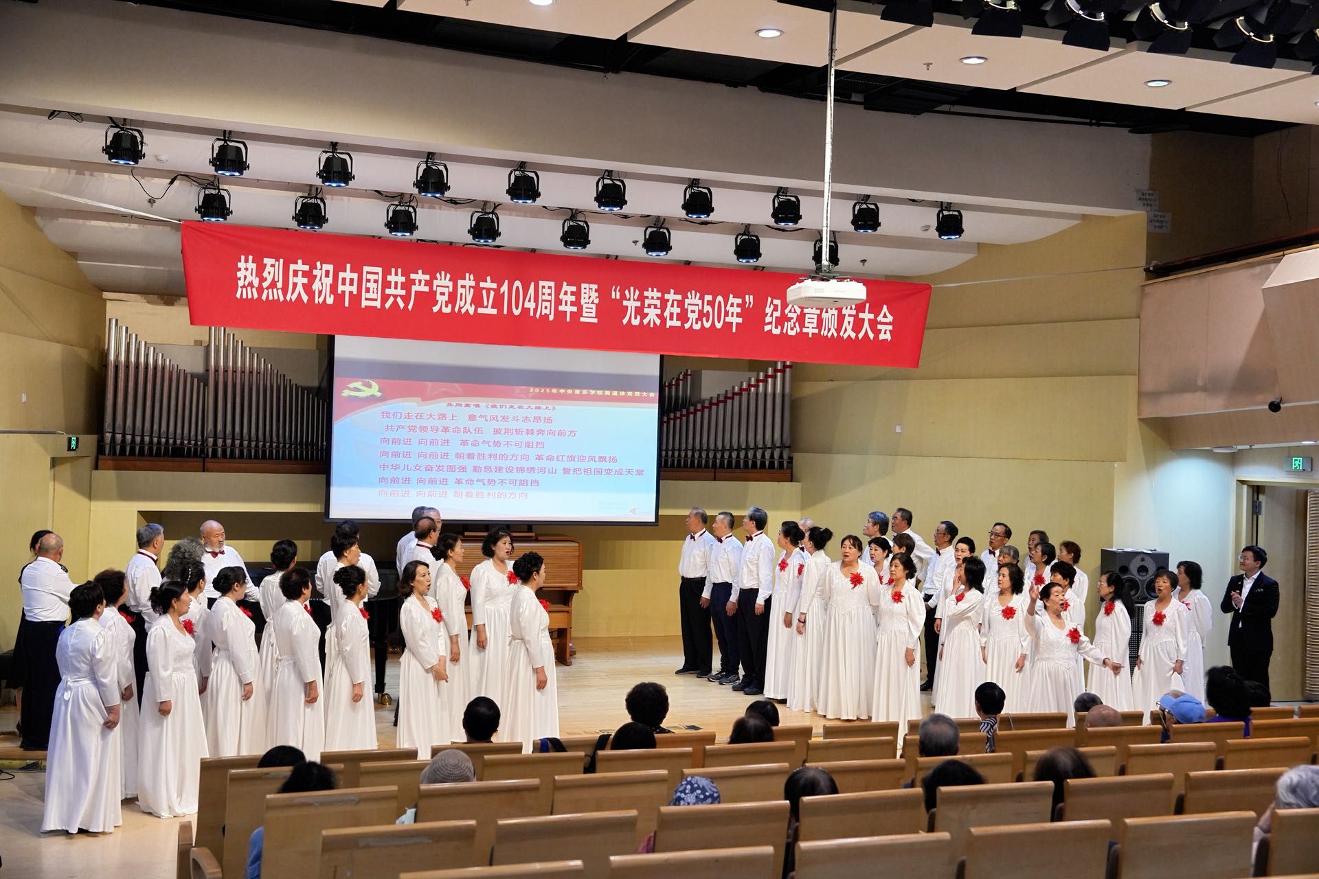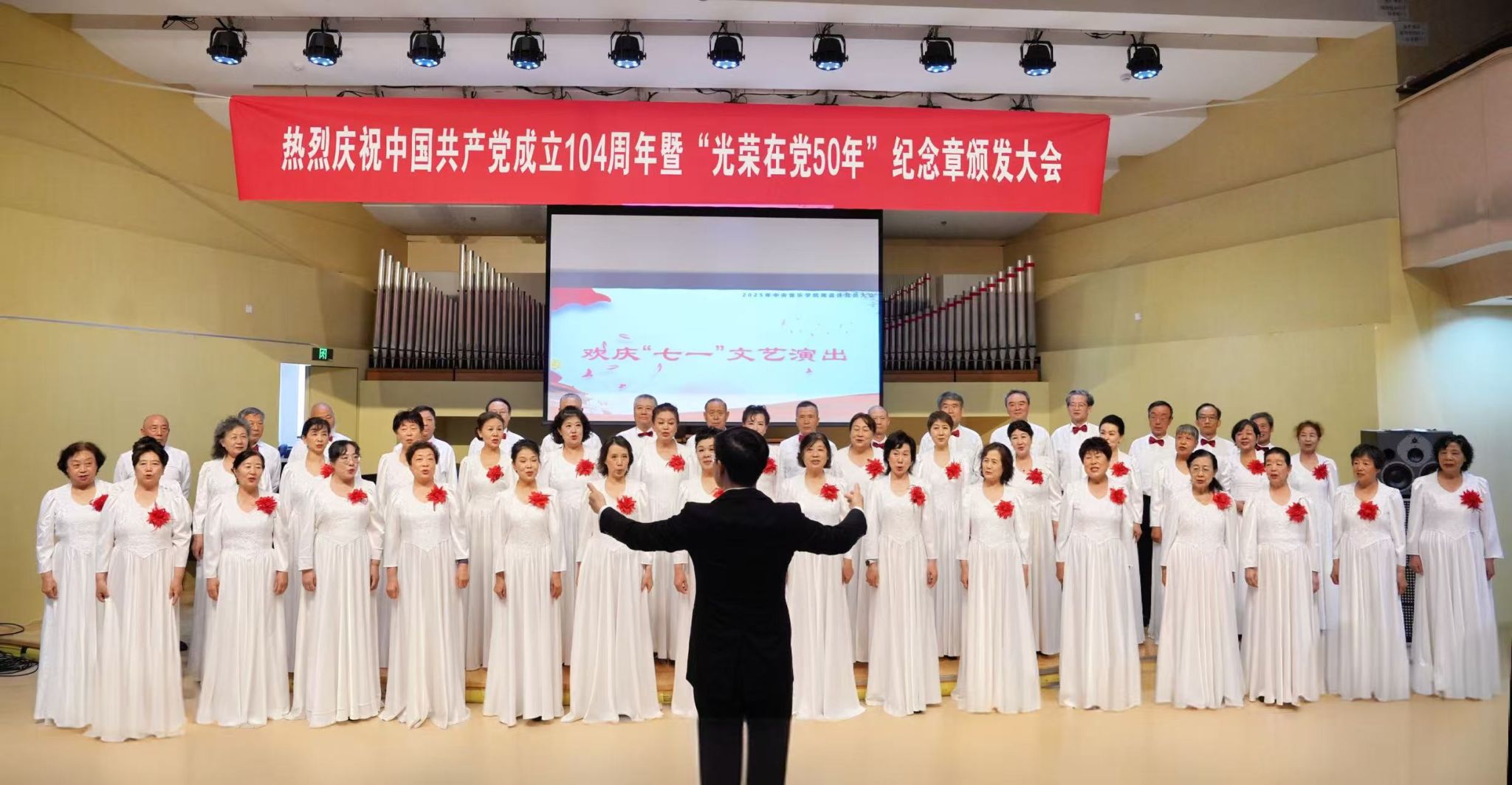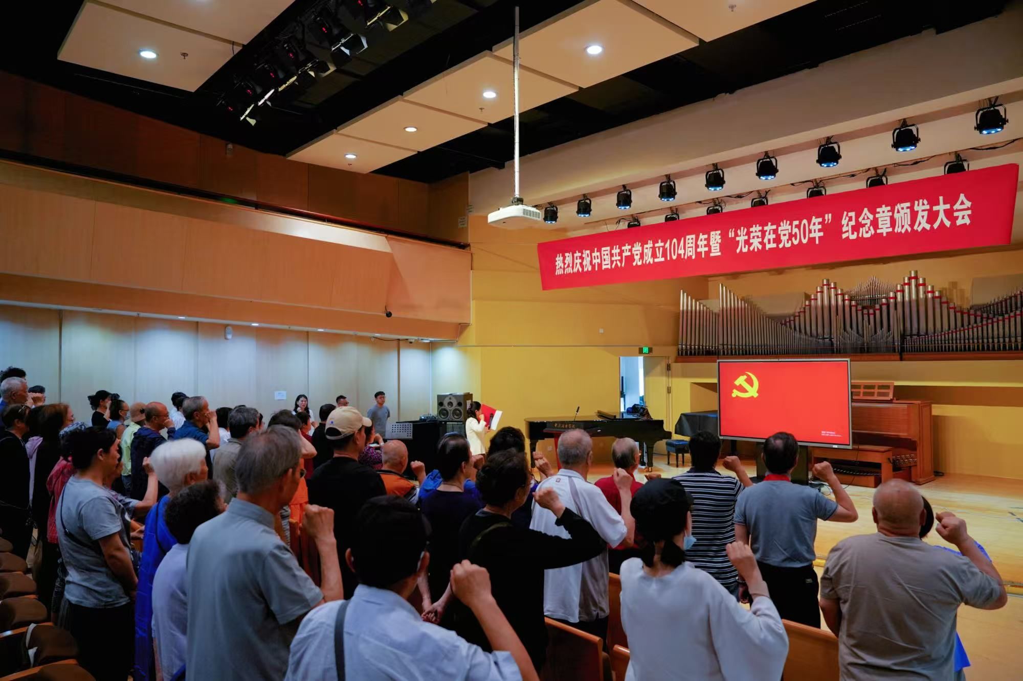 为了回顾党的光辉历程,传承红色革命精神,开云kaiyun官方网站离退休党总支于2025年6月30日上午举行“庆祝中国共产党成立104周年暨'光荣在党50年'纪念章颁发大会”。校领导、党委办公室负责人、离退休人员工作办公室负责人、离退休干部、职工中的党员代表、退休民主党派代表等百余人出席大会,共同见证这一光荣而庄严的时刻。大会在激昂的国歌声中拉开序幕。