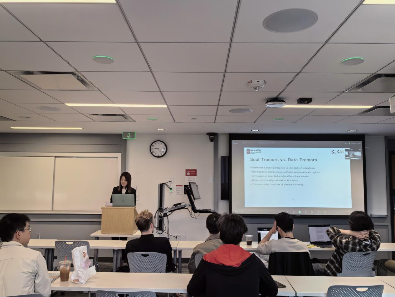 经过ICMC组委会的严格筛选,开云官网三位师生论文入选大会论文并作宣讲。潘宇与乔子千合作的论文《科学史的回响:音乐与视觉艺术中的科学理论与艺术表达》入选主会宣讲。张渊宣讲了其与张昕然共同完成的论文《虚拟合奏:通过网络化数字乐谱探索音乐活动的参与》(李小兵教授及肯尼斯·费尔兹教授为通讯作者);王心严分享了题为《人类与AI音乐创作之间的本体论边界》的研究。三场论文宣讲均激发了在场专家学者的热烈讨论。