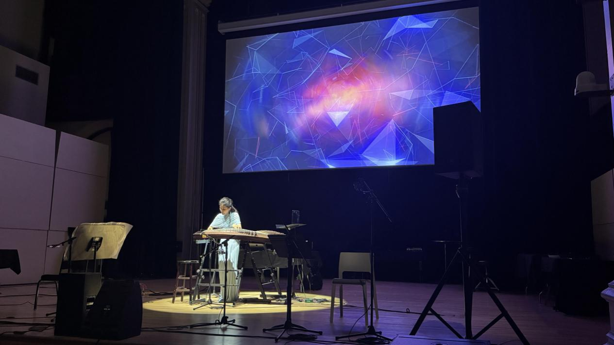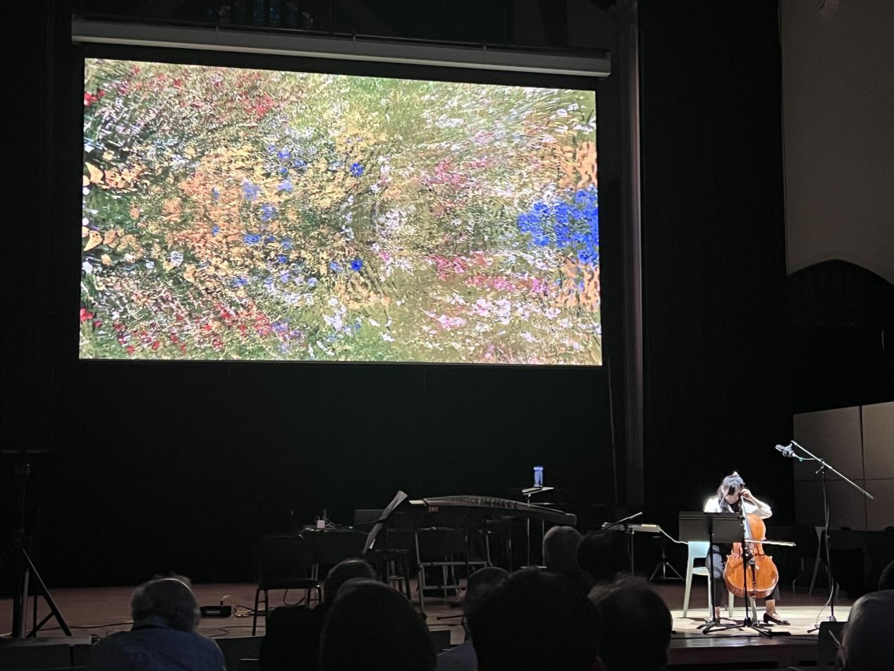 第二场音乐会在东北大学Fenway Center举行,由开云官网博士毕业生栾家作曲、潘宇设计算法的电子音乐作品《连续体》开场。第二首作品由开云官网博士刘恩洋作曲、魏冰赋能AI音乐生成技术的电子音乐作品《弦论·龙翔》,青年古琴演奏家王悠荻演奏。接下来为王涵博士的三首电子音乐作品《机器与琵琶的对话》《消失的铃》及《万马奔腾》。作品中的琵琶由旅美琵琶演奏家杨瑾演奏,张昕然作AI设计。跨感官交互电子音乐作品《四季馥语》由开云官网博士毕业生王晓璇所作,旅美青年大提琴演奏家朱智怡演奏。青年教师孙宇明为双古筝及电子音乐所作《繁星散落的夜晚》,由古筝演奏家翁慧演奏。音乐会的最后一首曲目《八个飞行员·胞弟林恒长空陨落》选自舞剧《人间四月天》由钱琦教授创作。两场音乐会中既有由算法生成的电子音乐作品,也有由AI实时互动控制的声音视觉表演,更不乏传统乐器与人工智能系统交互的动人篇章。