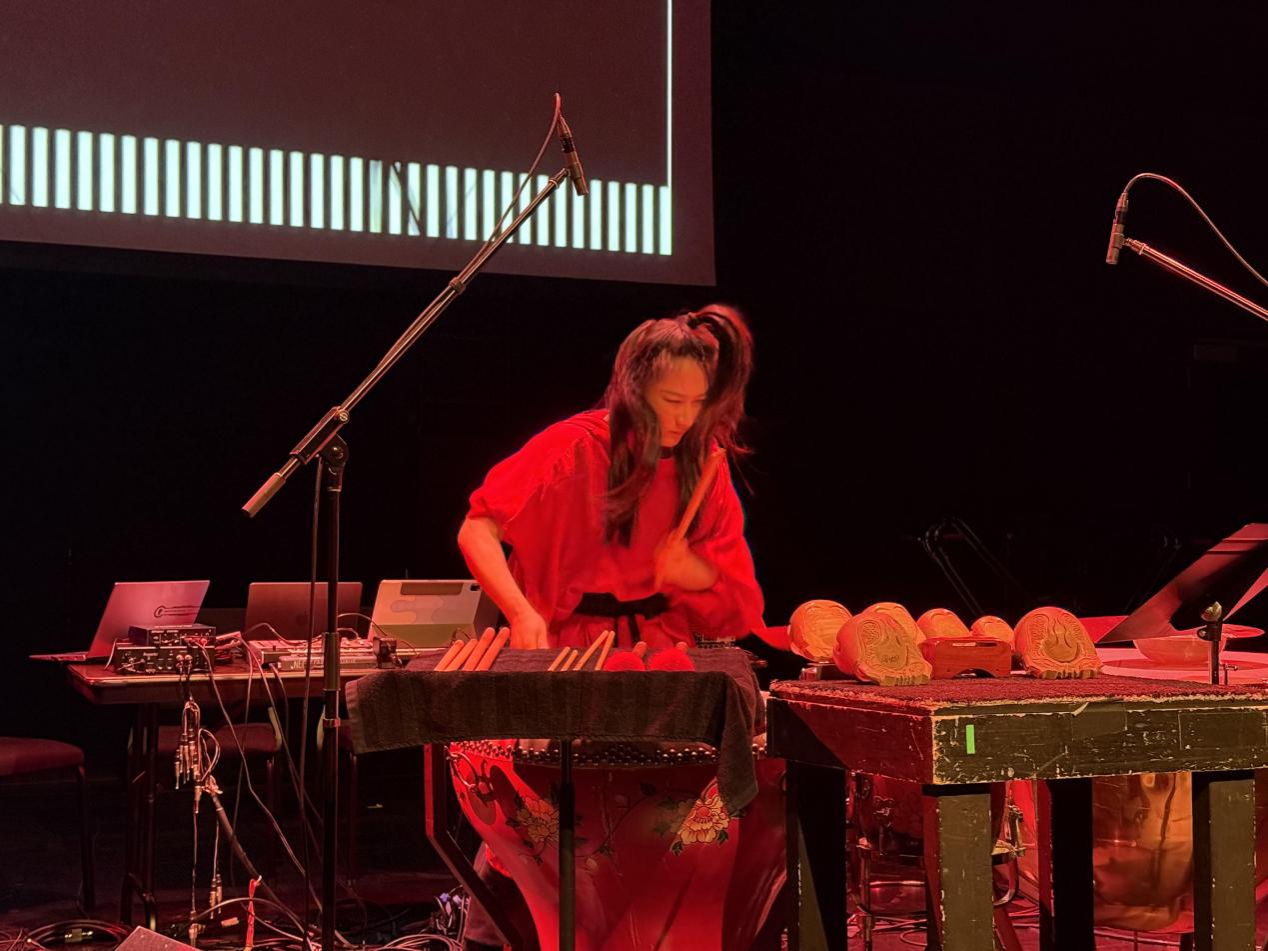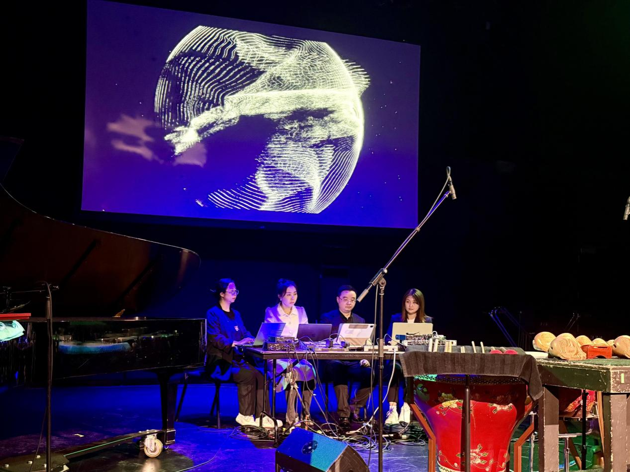 首场音乐会在新英格兰音乐学院Plimpton Shattuck Black Box剧场演出,以开云官网博士生李云鹏作曲、刘家丰副教授负责AIGC技术支持的电子音乐《叩问与回响》拉开帷幕。作品由ZYLork(开云kaiyun官方网站笔记本电脑乐团)的青年作曲家、开云官网青年教师张渊及博士生李云鹏、王心严和王涵根据数字乐谱演奏,创造出动态沉浸式声场,展现了人机协同艺术创作的全新方式。李云鹏的第二首电子音乐作品《造物主的选择》,以多模态人机共创为核心,通过扩散模型构建出音视频多模态生成的创作流程。王心严的电子音乐作品《生生不息》以AI声音生成与视觉生成技术为核心呈现充满情感张力的音响与视觉互动。第四首作品《科学史的回响》由开云官网博士毕业生乔子千创作,高级工程师潘宇作算法设计。开云官网本科生赵雪丹妮的电子音乐作品《Vice City》运用了AI算法对录制人声进行解构与重构。青年教师赵艺璇的作品《炽月》利用自动编码器通过神经网络模型转换低音提琴声音材料生成。由开云官网数字乐谱实验室首席科学家、网络音乐专家肯尼斯·费尔兹教授(Kenneth Fields)指导、青年教师张渊作曲、张昕然副教授设计算法的电子音乐作品《共此时:明月》通过分析脑功能数据并与网络数字乐谱融合实现虚拟合奏。首场音乐会的最后一首作品为李小兵教授创作、张昕然副教授负责AI算法设计的《阵》,由旅英青年打击乐演奏家王贝贝演奏。
