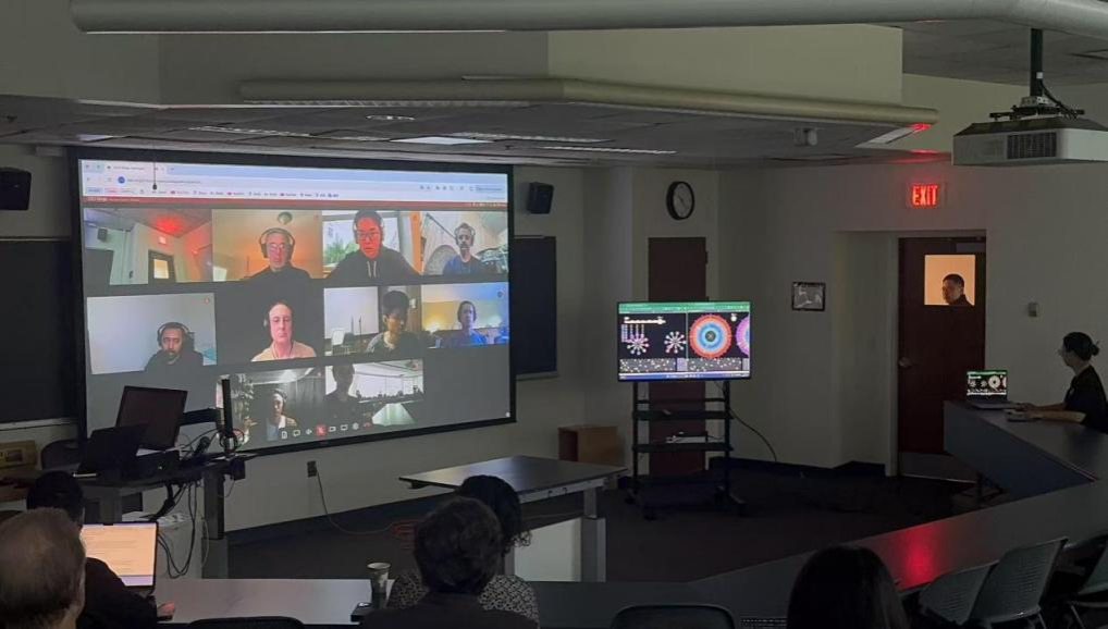 当天举行的专题工作坊同样备受关注。肯尼斯·费尔兹教授线上主持的“Netronome网络节奏器”工作坊吸引了众多学者及音乐科技爱好者的积极参与。他在线上展示了一种基于网络协作的节奏序列器系统,演示了通过互联网将不同地域的演奏者连接起来,共同创造音乐节奏的创新模式,并与世界各地的多位音乐家、学生一起连线开展了线上实时演奏。张渊在现场组织参与者亲身体验了网络延迟所产生的独特节奏效果。