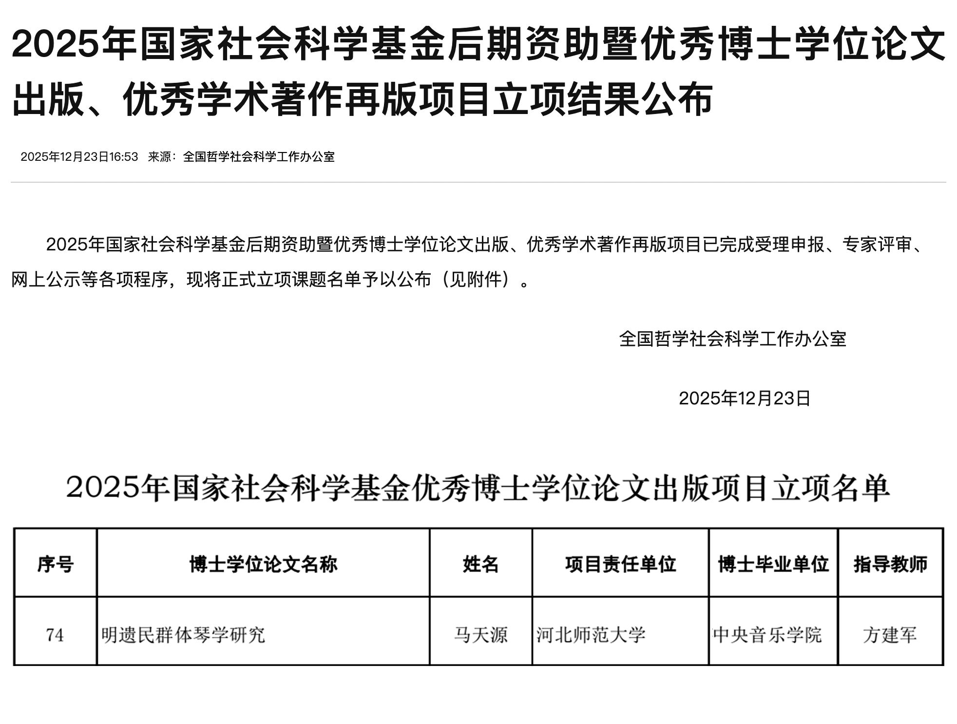 近日,全国哲学社会科学工作办公室公布2025年国家社科基金优秀博士学位论文出版项目立项结果。开云官网音乐学系2023届博士毕业生、现就职于河北师范大学音乐学院的青年教师马天源的博士学位论文《明遗民群体琴学研究》成功获批,成为本年度该项目中唯一获资助的音乐类博士学位论文,这也是音乐学系博士毕业生连续第二年获此殊荣。