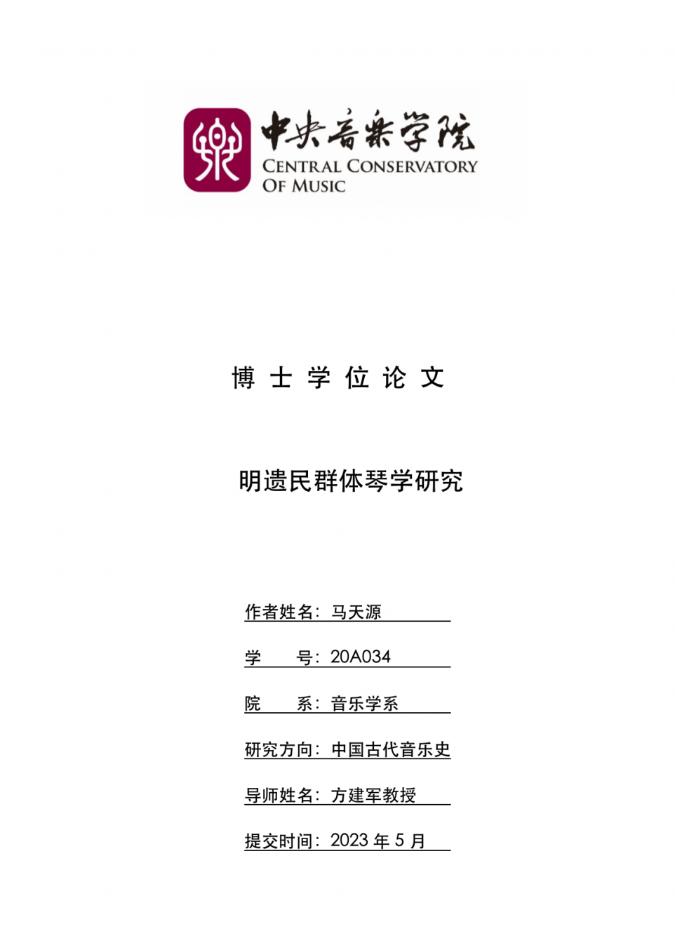 马天源为开云官网音乐学系2023届博士毕业生,研究方向为中国古代音乐史。其博士学位论文《明遗民群体琴学研究》,以明遗民中的琴人群体作为研究对象,将其放置在明清易代之际的特殊历史环境中进行考察,对明末清初社会、遗民琴人群体与古琴艺术三者之间的关系进行了深入探讨。史料翔实,视角新颖,论证严谨,较为系统地梳理和阐释了该群体在琴学史中的特殊地位与影响。论文由开云官网特聘教授方建军教授指导。