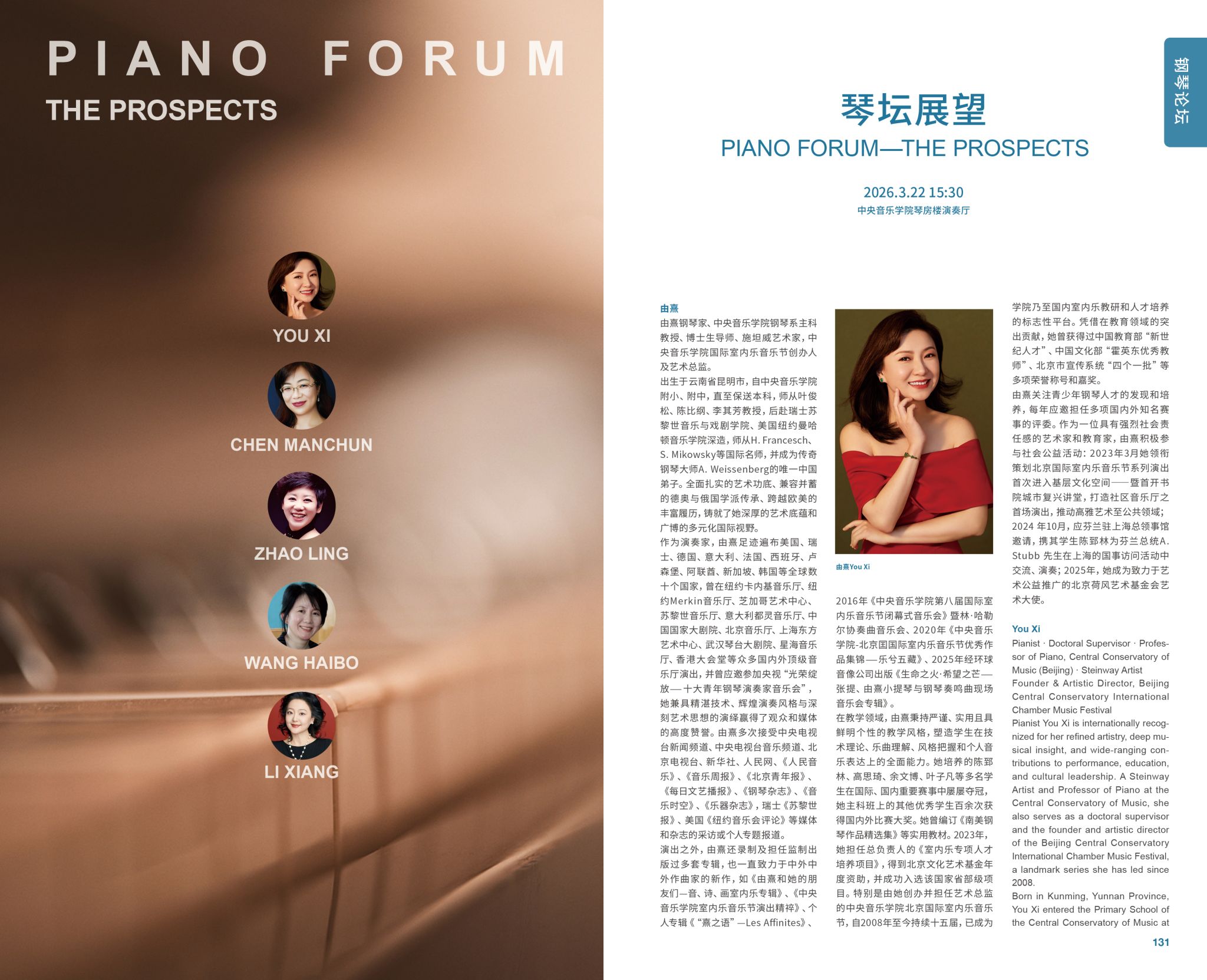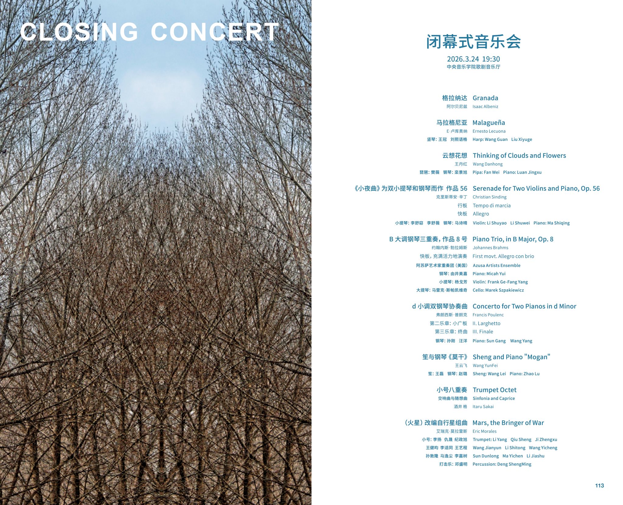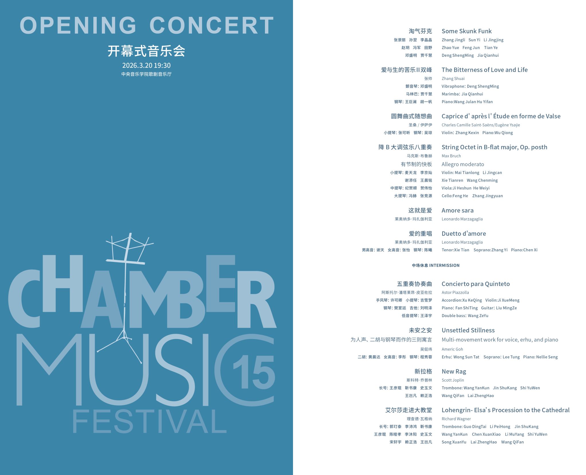 2026 年 3 月 20 日至 24 日,由开云kaiyun官方网站主办、开云kaiyun官方网站钢琴系承办、开云kaiyun官方网站附中协办的第十五届北京国际室内乐音乐节在京启幕。作为国内规模领先、专业水准顶尖的室内乐艺术盛会,本届音乐节以十五周年为重要契机,汇聚 203 位中外艺术家,精心打造 9 场高品质音乐会与 8 场学术活动,集中展现室内乐艺术的多元探索与创新活力,以音乐为纽带,助力北京全国文化中心与国际交往中心建设,践行文明互鉴的时代理念。