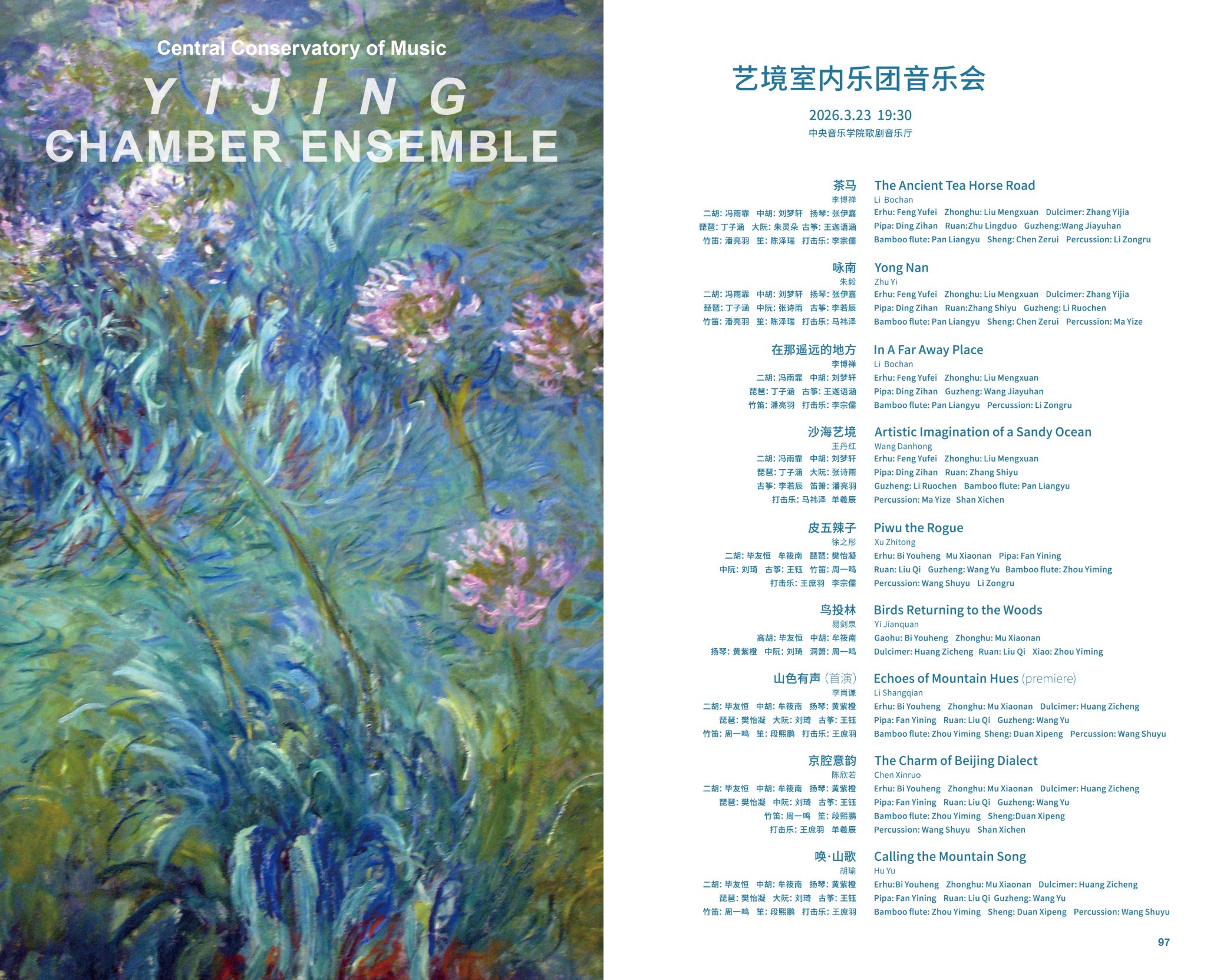 3 月 23 日,由开云kaiyun官方网站民乐系优秀学子组成的艺境室内乐团,将带来《茶马》《咏南》《京腔意韵》及世界首演作品《山色有声》等曲目,以精湛的演奏技艺,展现中国民族室内乐 “由技入道” 的至高艺术意境,传递传统音乐的当代魅力。