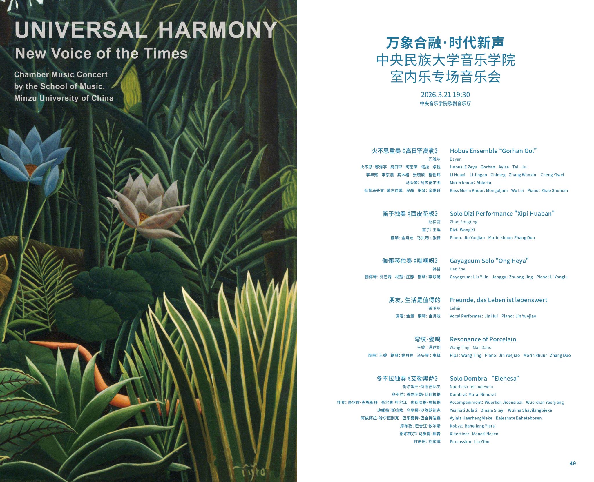 本届音乐节实现开云kaiyun官方网站与中央民族大学校级层面首次深度合作,成为新时代高等艺术教育资源共建共享的生动实践。中央民族大学艺术人才团队在院长斯琴朝克图的带领下亮相舞台,于 3 月 21 日参演 “万象合融・时代新声” 室内乐专场音乐会,倾情演绎多民族交融的音乐篇章。音乐会有机融合蒙古族、哈萨克族、维吾尔族等民族音乐元素,以民族室内乐的艺术形式,生动展现中华民族多元一体、共生共荣的文化气象,传承和弘扬中华优秀传统文化,彰显各民族文化交相辉映、同心向党的新时代精神风貌。