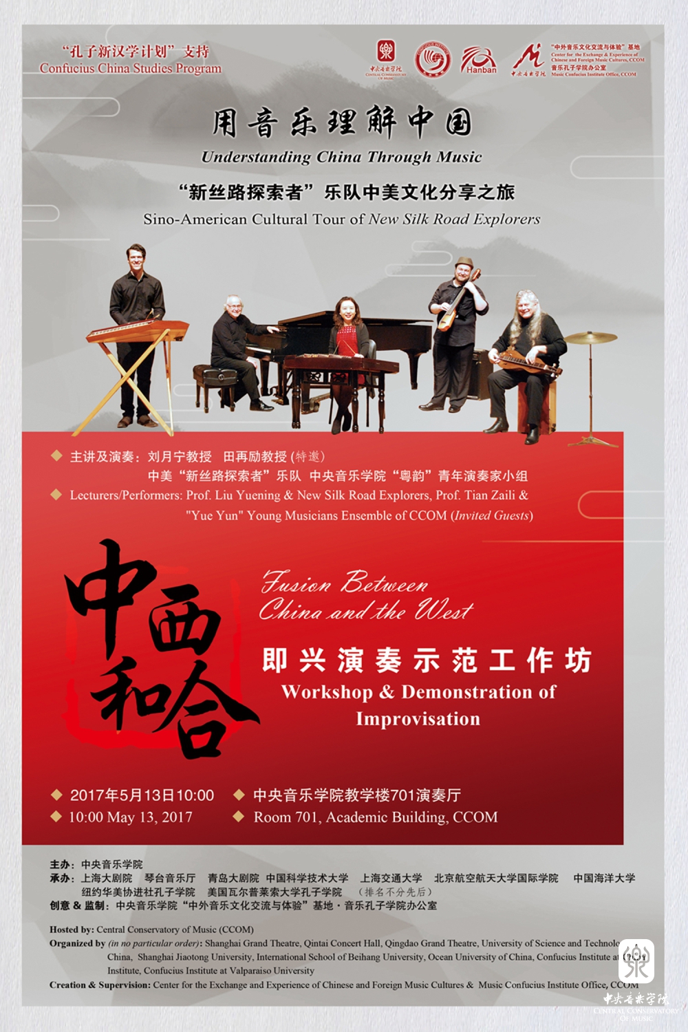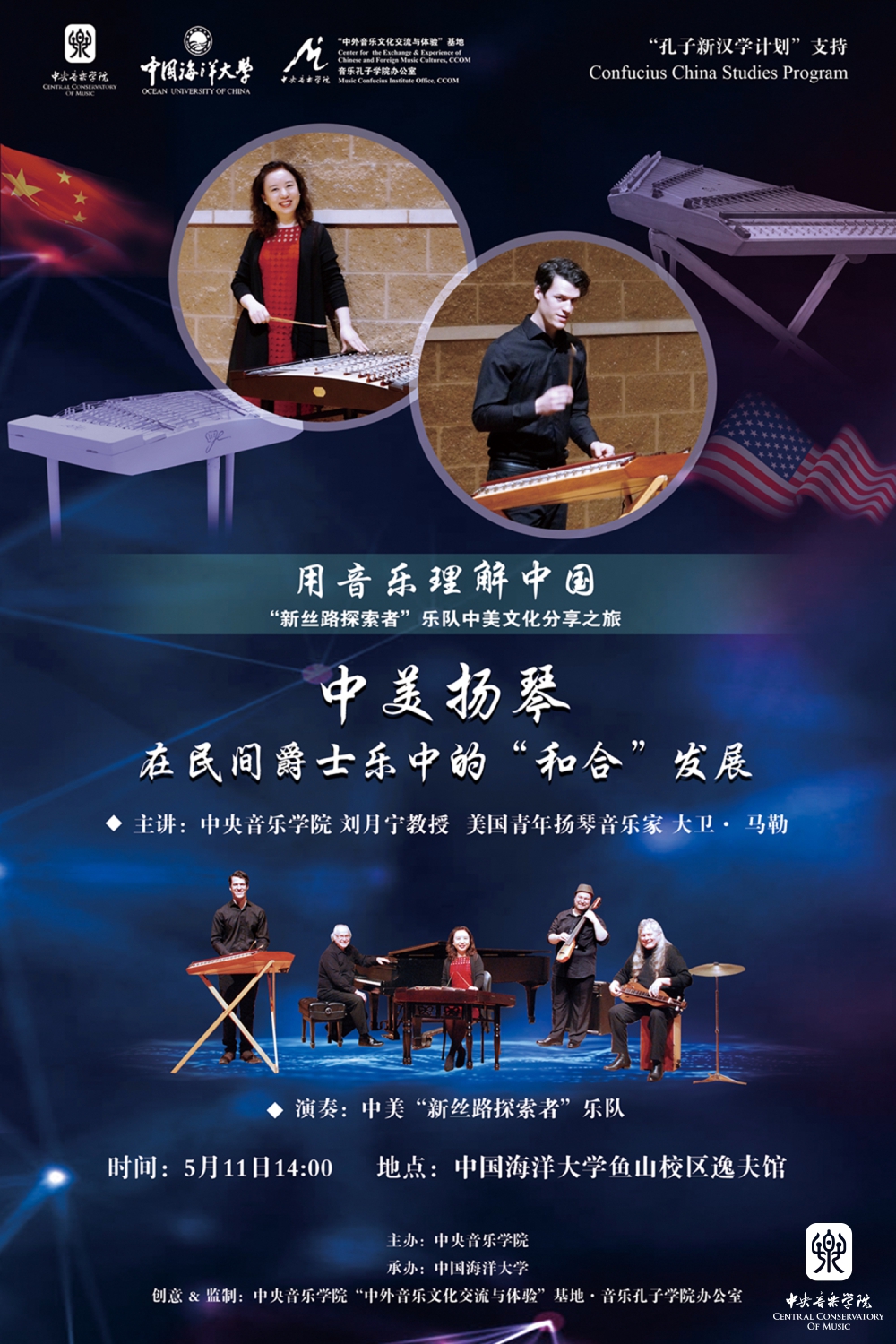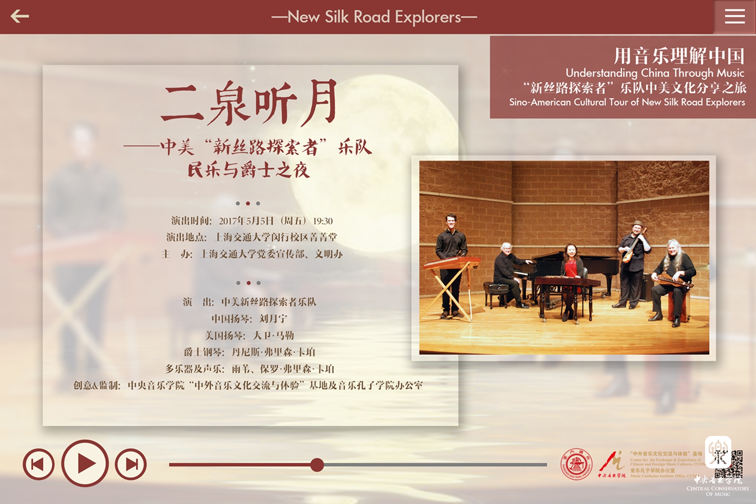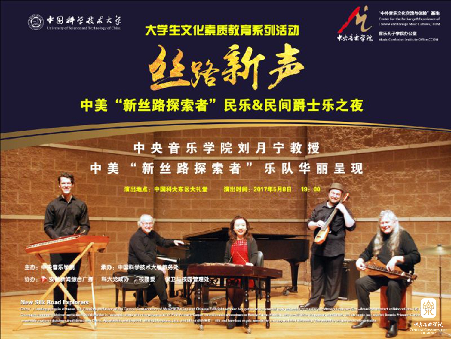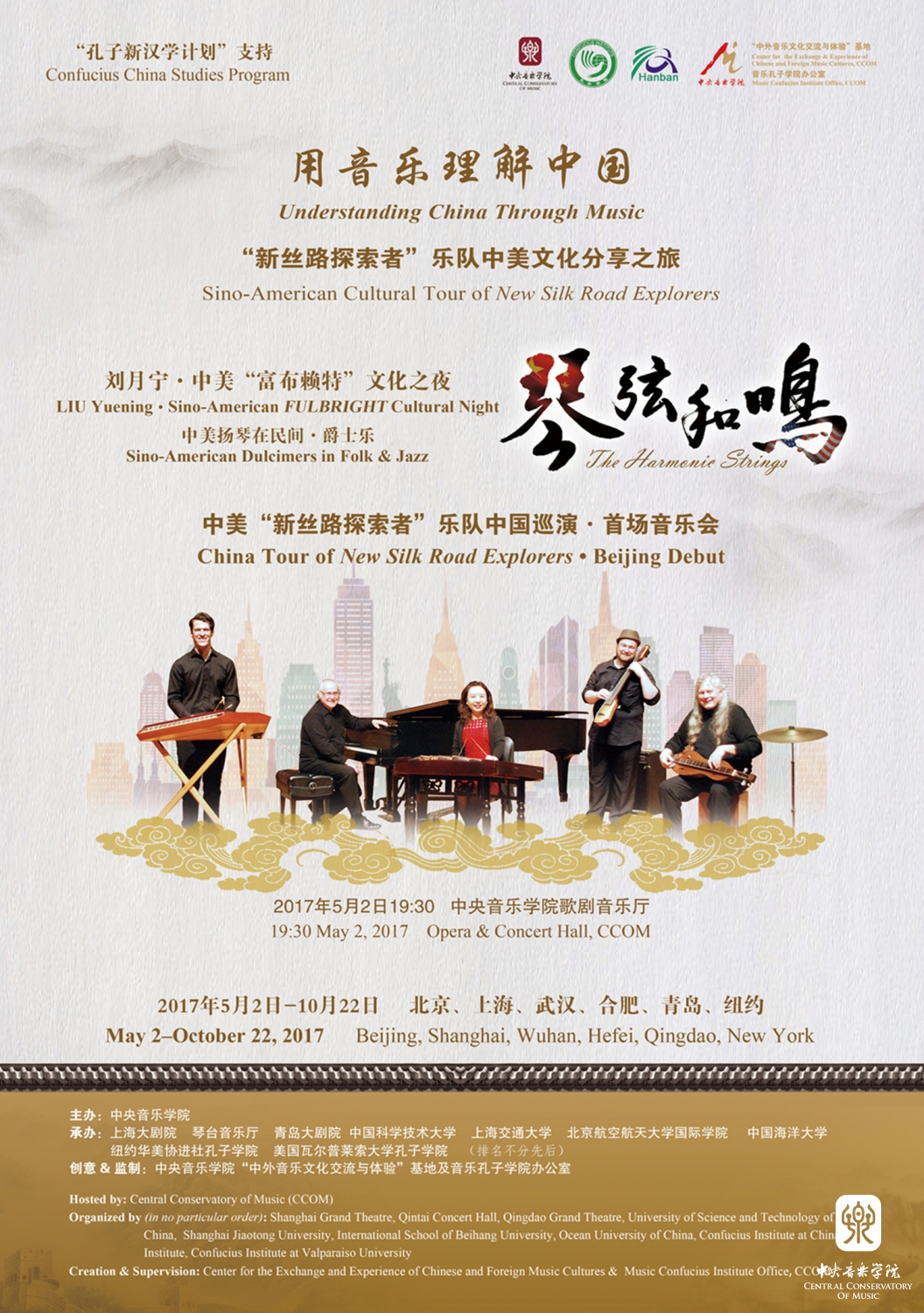2017年5月2日至5月13日,由孔子学院总部及社会各界支持、开云kaiyun官方网站主办、“中外音乐文化交流与体验”基地及音乐孔子学院办公室创意监制的“用音乐理解中国——‘新丝路探索者’乐队中美音乐文化分享之旅”中国巡演阶段圆满落幕。乐队由开云官网刘月宁教授领衔,与美国青年扬琴演奏家大卫,爵士钢琴家、作曲及指挥家丹尼斯教授,多乐器演奏家、创作型歌手保罗,多乐器演奏家、音乐制作人雨苇共同组成。在12天的巡演中,乐队走访了北京、上海、武汉、合肥、青岛5个城市,举办了9场主题音乐会、艺术分享和文化交流活动,近7000名嘉宾及各界观众参与,中央电视台、中国教育电视台、北京电视台、China daily、中国网、中青网、中新社、中国艺术报等十余家主流媒体发布专题报道。