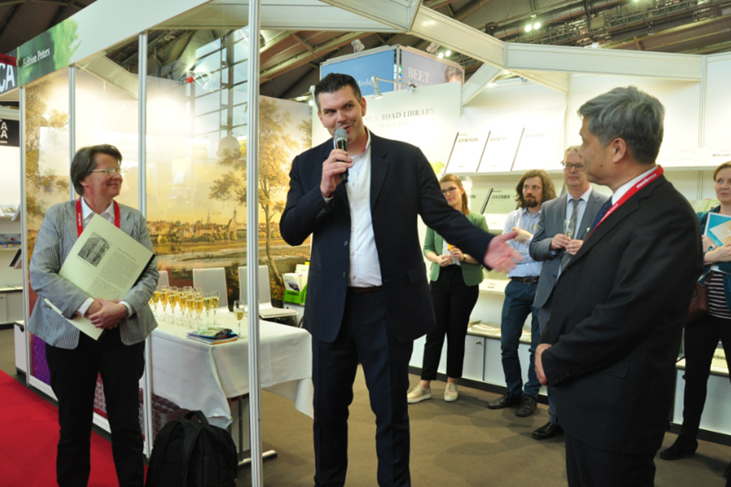 在当日稍晚的招待酒会上,法兰克福展会负责人也进行了致辞,表达了对两家出版社的新项目的祝贺。参展的各大出版社代表以及对中国新音乐创作感兴趣的来宾也参加了招待活动,他们对此次出版作品的创作和演出情况提问,对作曲家的情况进行了了解,并对两家出版社的合作和发展表达了祝愿。