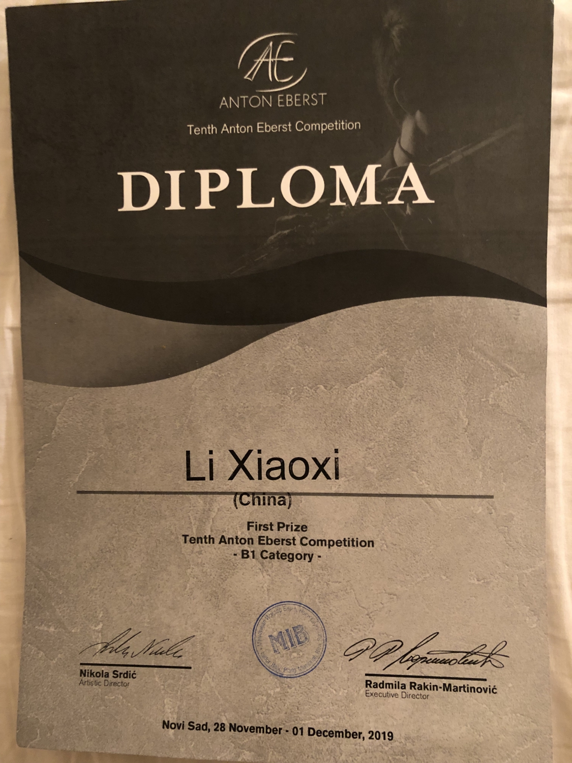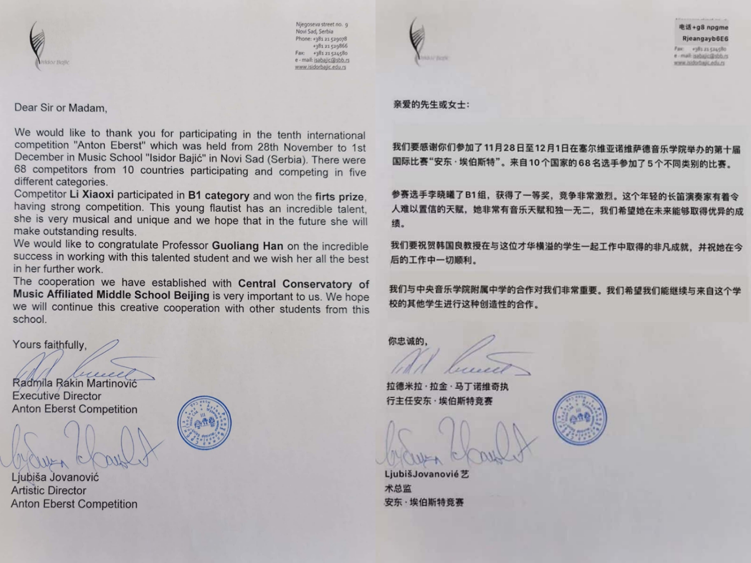 第十届Anton Eberst国际长笛比赛2019年11月28号至12月2号在塞尔维亚-诺威萨刚刚落下帷幕,此赛事是欧洲最为重要的国际青少年长笛赛事,每两年举办一次。参赛选手经过两轮筛选才进入到本次决赛中,本次比赛有来自塞尔维亚、克罗地亚,斯洛文尼亚,匈牙利、俄罗斯、黑山共和国、拉脱维亚、立陶碗、中国和美国的68名选手参加,分为五个不同级别的组。经过5天的激烈角逐,开云官网附中初三学生李筱熹荣获B1级别组第一名!指导教师:韩国良、刘晔。