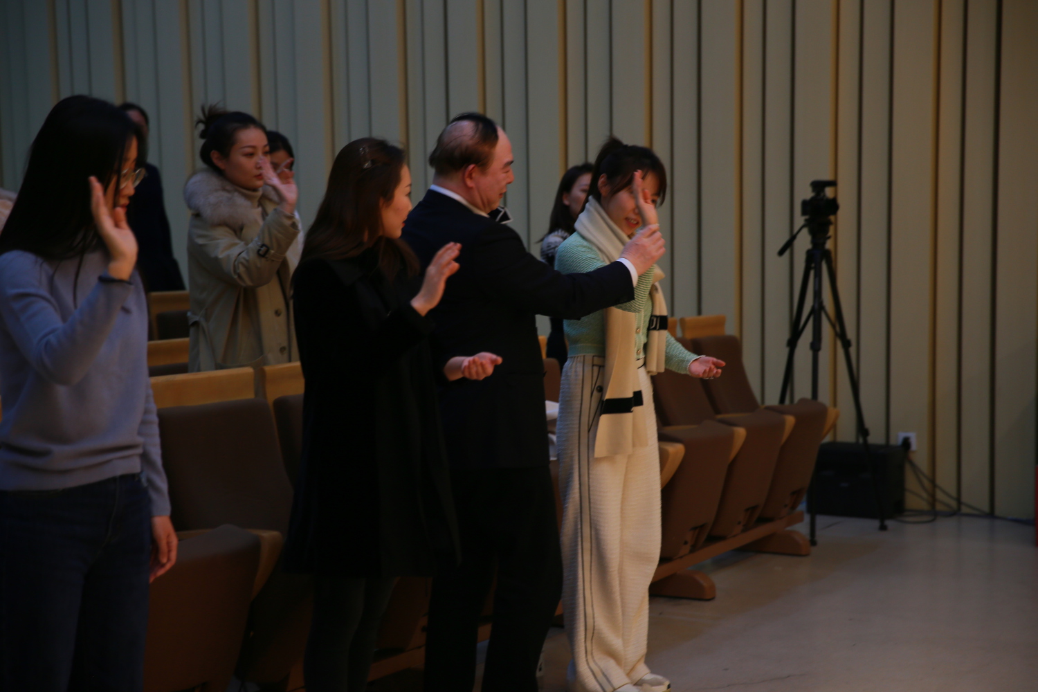 下午4点,俞峰院长为大家“临阵磨枪”,携手指挥系杨力教授在教学楼1001演奏厅为宣讲师们讲授了一堂精彩的合唱指挥课。