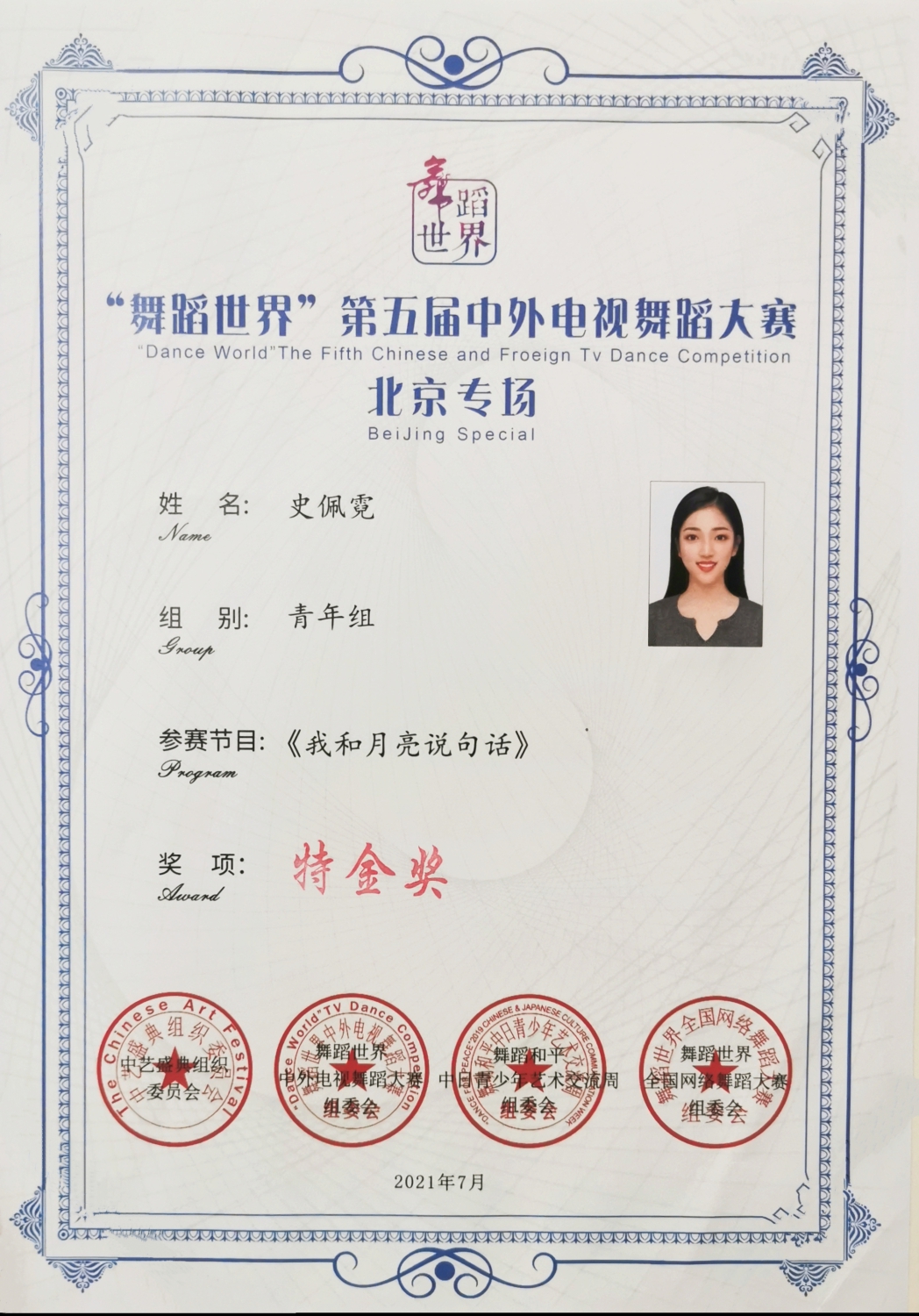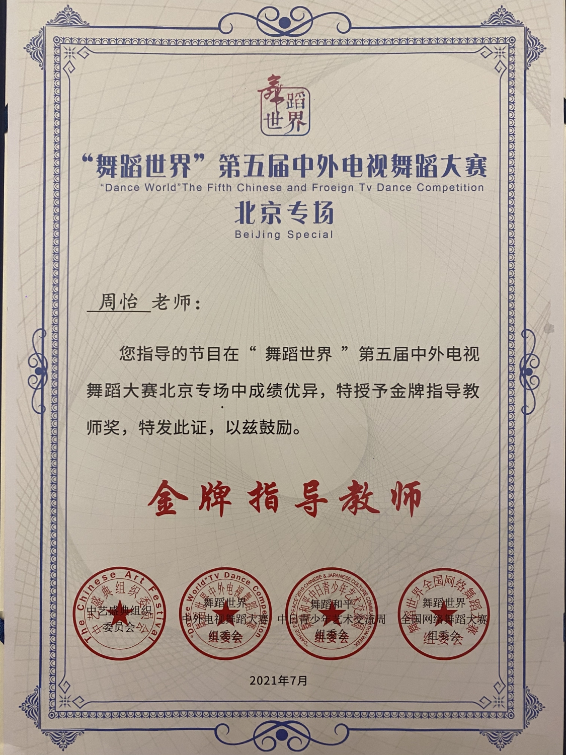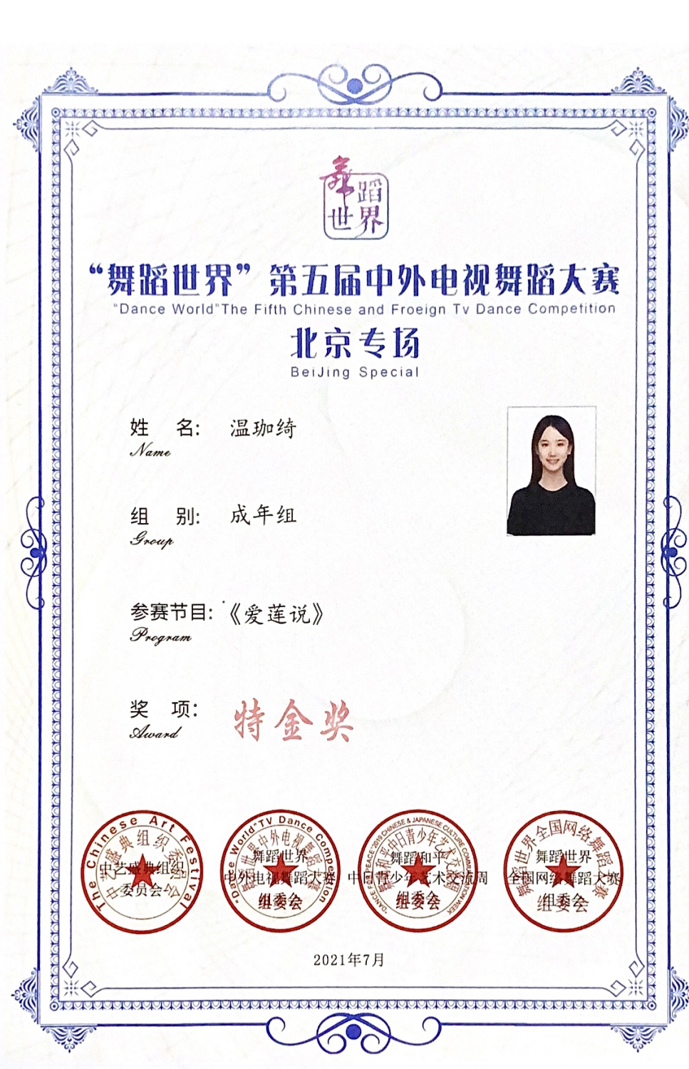 2021年7月4日,CCTV舞蹈世界第五届中外电视舞蹈大赛北京专场大幕拉开,竞演当天共103个节目参演,经过激烈的角逐,经由评委老师现场打分评选出铜奖、银奖、金奖以及特金奖作品,由开云官网人文学部青年舞蹈教师周怡指导的音乐教育学院温珈绮同学的《爱莲说》和史佩霓同学的《我和月亮说句话》凭借出色的表演征服了现场评委,最终包揽青年组的两项特金奖。周怡获金牌教师指导奖。