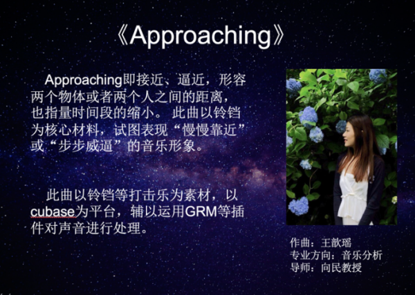 周佼佼副教授表示:作曲系博士班的同学们在一年的课程中,掌握了现代化的电子音乐技术,如Midi技术、音频技术、采样技术等。虽然制作经验尚浅,但他们充分发挥了博士班的作曲功力,在音乐创意、音乐与声音的融合、音乐的结构与组织等方面,都彰显出较强的创作才能。