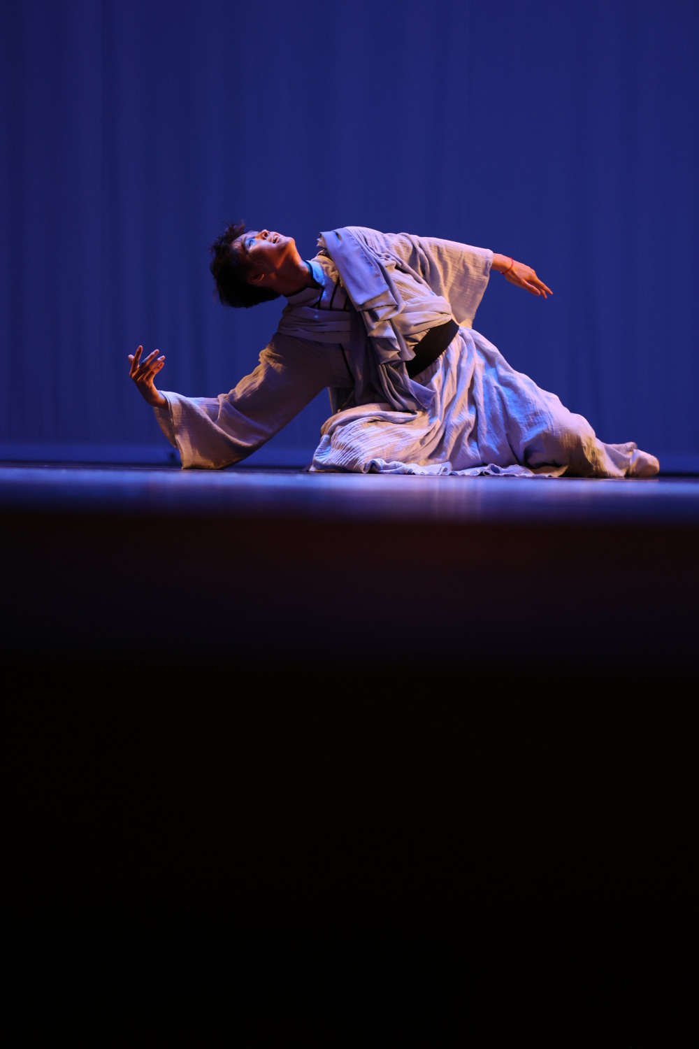 音乐起于钢琴的空八度,空灵岑寂;身着藏族服饰的舞者在宝蓝色的灯光下出场。黑管与巴松的循环音型象征着从杰马央宗冰川下融化酣淌的水流,作品中部大提琴独奏是其中凸显藏族元素的部分,长旋律的舒徐广阔而深情,延续着对水源奔流描绘。舞者的几次连续跳跃似乎摘取了来自水源的信仰,配以藏铃的脆响,让人同感灵动。