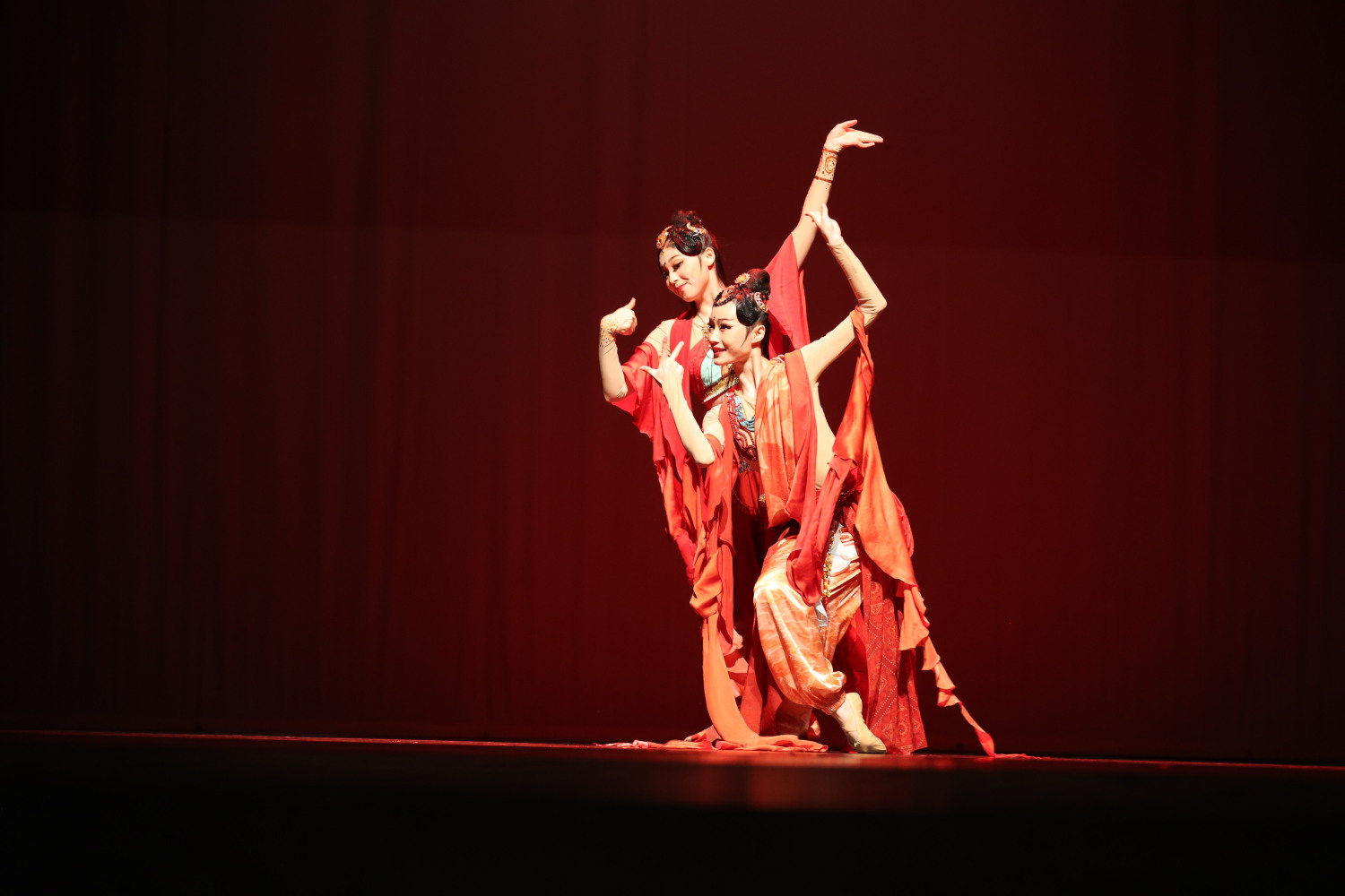 敦煌莫高窟中的经变画给予了作者的创作灵感,开场的亮相红绫似火,原本嵌于壁画中的形象随着长笛的旋律逐渐活化,宗教之静谧、异域之神秘交错相生。本是西北中原的舞姿渗透了外来西域影响,展现出一种颇为和谐的交流与对话。琵琶成为勾勒异域风格的首选,热烈的舞蹈主题递与不同的声部,人间乐舞的繁荣景象浓墨淋漓,显示出创作者们对音乐感觉的极强把握。