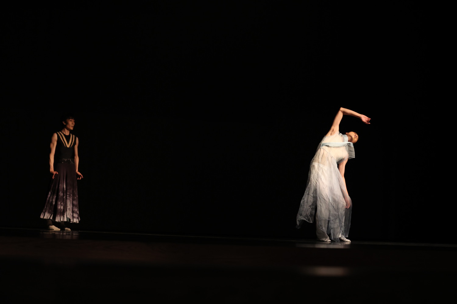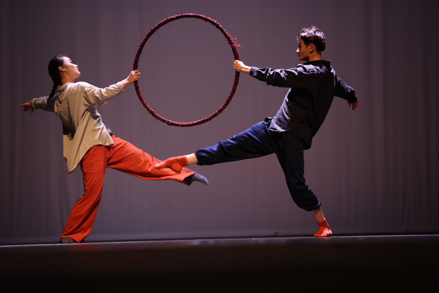 第一部作品《圆间距》以“圆”为意象与道具,将舞台交付给两位舞者与一个圆环。作曲家保留了传统舞蹈音乐中“慢-快-慢”的结构,慢板中被抹去的节奏和律动,重新在舞者的肢体中被勾画出来。快板部分提琴的拨弦、钢琴的循环节奏型共同形成了不规律的织体,衬以两位舞者轮流在圆环内来往的动态。
