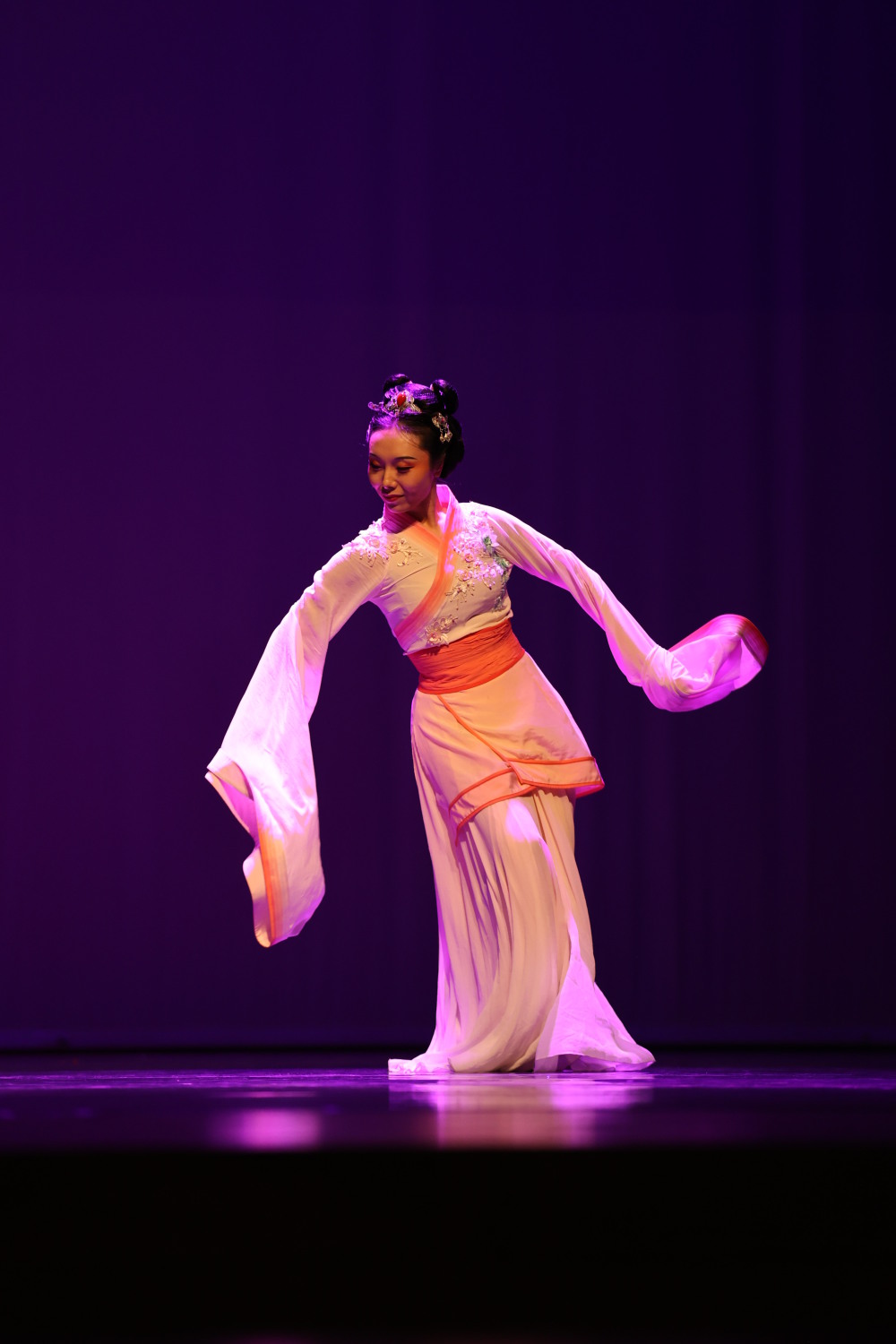 舞台的左方的司鼓和筚篥,与舞者共同构成了一方清简的空间,所有的表演者聚集在其中,互相之间的照映明显且默契。来源于古代汉砖上的舞姿成为创作者们共同的意象,舞者一袭汉唐舞的装束,采桑女罗敷伶俐聪颖的形象带起水袖与裙摆的柔散,填补了极简编制中的飞白。选取筚篥作为编制之一,不仅考虑到与传统吹打乐的形似,亦是贴合汉唐舞之中的历史渊源。