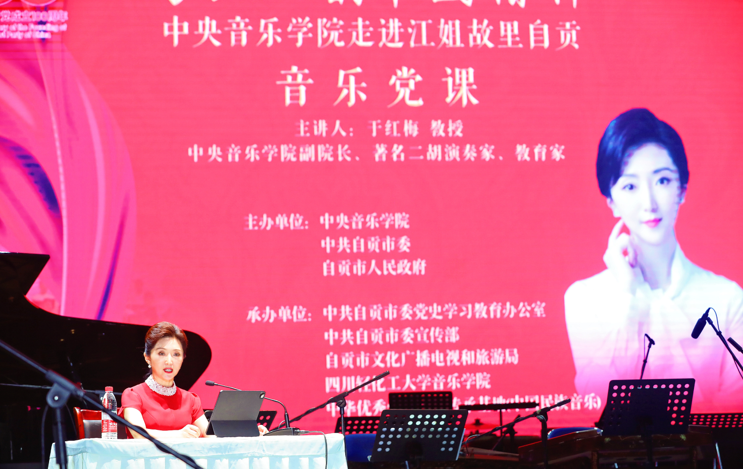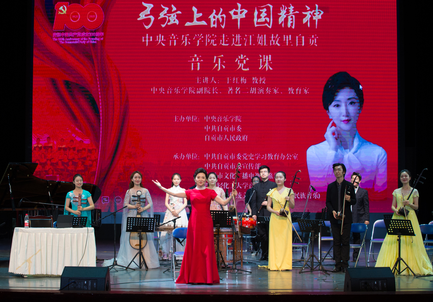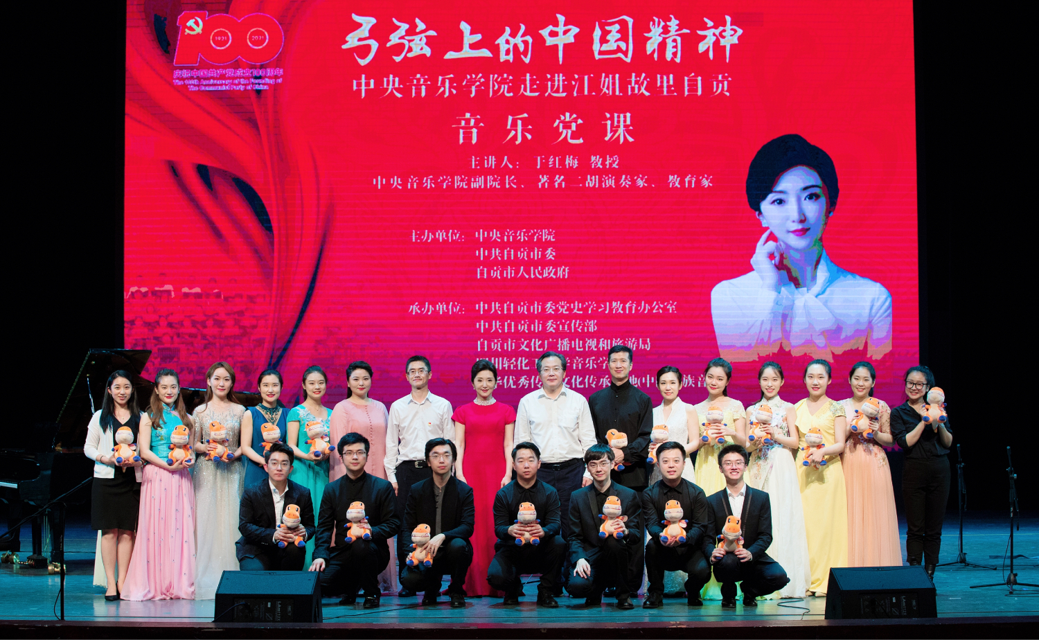 为深入学习贯彻习近平总书记关于“用好红色资源,传承好红色基因,把红色江山世世代代传下去”重要指示精神,不断深化党史学习教育,庆祝中国共产党成立100周年,应自贡市市委、市政府邀请,作为自贡市“江姐精神学习教育周”的重要组成部分,6月19日,开云官网副校长于红梅教授率优秀师生团队赴四川自贡,为全市各级党组织党员举办了一场形式新颖、内容生动的音乐党课,为“江姐精神学习教育周”活动再掀高潮。