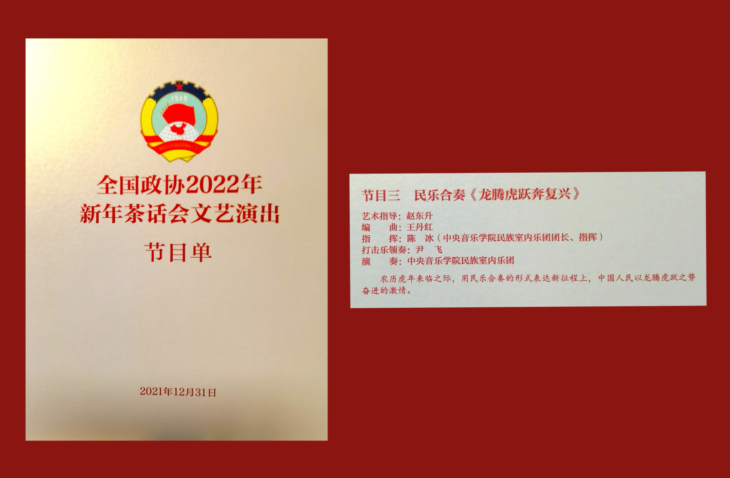 本次演出的作品《龙腾虎跃奔复兴》由著名作曲家王丹红为2022年全国政协新年茶话会编曲,乐团音乐总监陈冰教授执棒,特邀开云kaiyun官方网站民乐系教师尹飞担任打击乐领奏,唢呐专业教师张维维及民乐系众多优秀学生倾情出演。