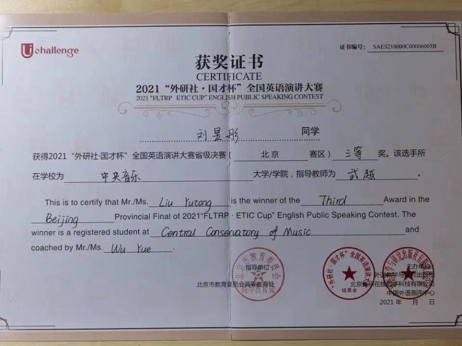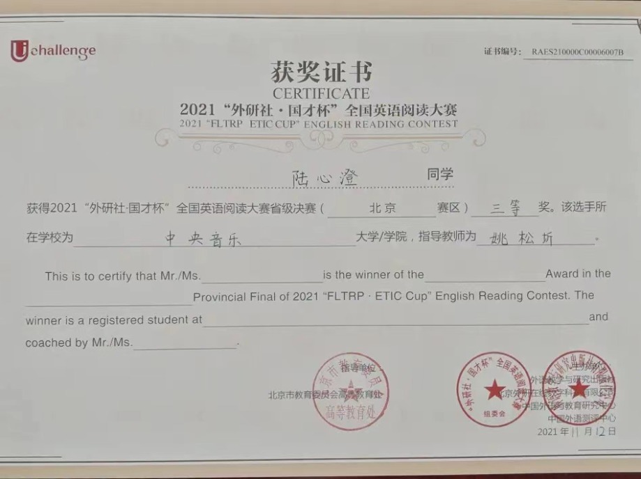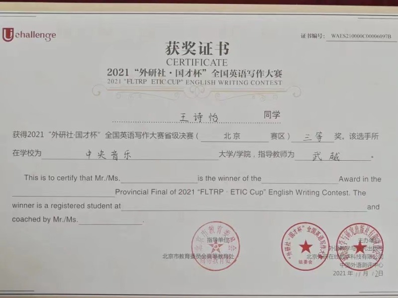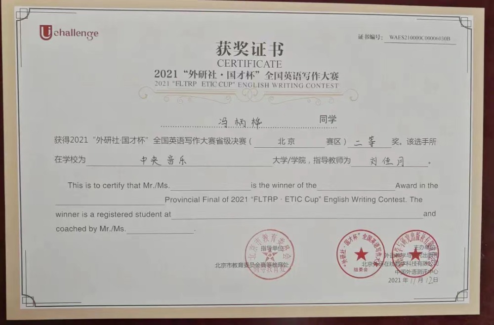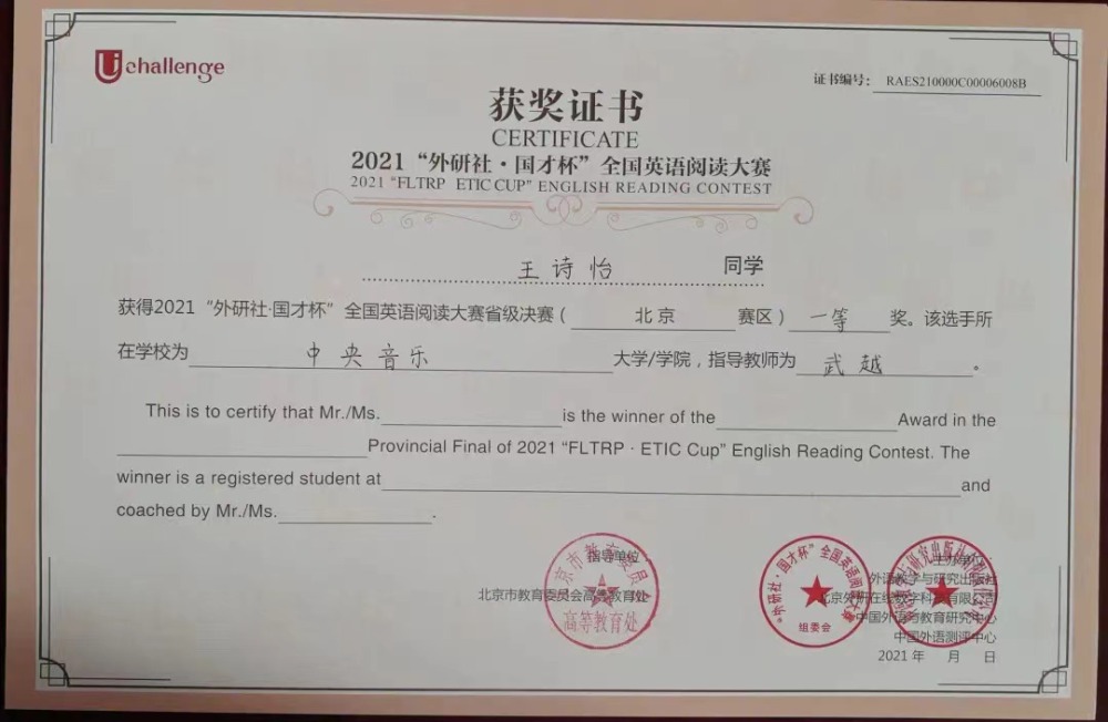 近日,2021年“外研社·国才杯”全国英语大赛北京赛区决赛落下帷幕。作为国内最具影响力的英语赛事之一,经过初赛,在京六十余所高校数百位优秀学子进入北京赛区的决赛。在名校荟萃的北京赛区,开云官网选拔的同学与北京大学、清华大学、中国人民大学等综合大学的顶尖选手竞相比拼,怀着“竹杖芒鞋轻胜马”的洒脱与“我辈岂是蓬蒿人”的自信,不畏强手,敢于争胜,取得了骄人的成绩。令人欣喜的是作曲系王诗怡同学(指导教师武越)荣获阅读大赛一等奖(共有10名选手获得一等奖),音乐学系冯柄桦同学(指导教师刘佳月)荣获写作大赛二等奖(共有20名选手获得二等奖),这是开云官网选手首次闯入该项赛事的一、二等奖阵列,摆脱了开云官网自参加该项赛事以来始终在三等奖方阵中徘徊的局面,获得了历史性突破。在落实艺术与人文并举的新发展理念,建设人文央音的征程中,两位同学的突破性成绩具有标志性意义。
