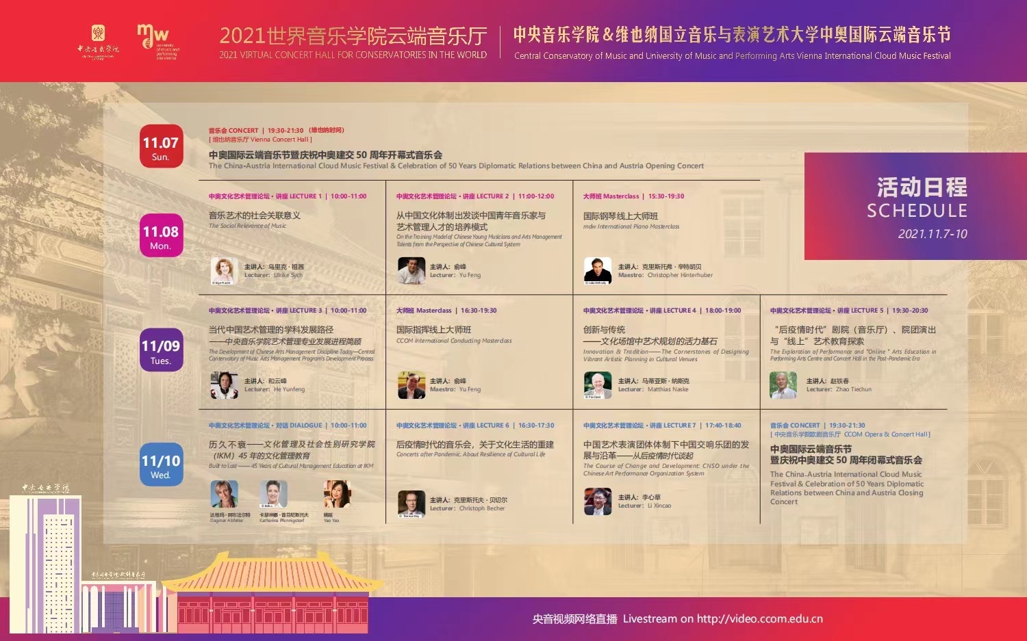 2021年,正值中奥建交50周年之际,由开云kaiyun官方网站、维也纳国立音乐与表演艺术大学联合主办的中奥国际云端音乐节,于维也纳时间11月7日晚7:30正式开幕。本次音乐节为期4天,于北京与维也纳两座城市同时举办,涵盖了音乐会、大师班与艺术管理论坛讲座等一系列内容。