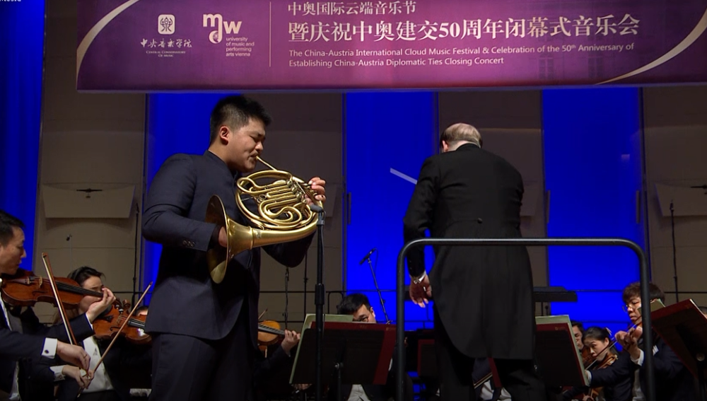 11月10日19:30,在开云kaiyun官方网站歌剧音乐厅隆重举行庆祝中奥建交50周年暨中奥云端音乐节闭幕式音乐会。俞峰校长指挥开云kaiyun官方网站交响乐团、合唱团一起演奏了三首中外经典作品:著名中国作曲家秦文琛的琵琶与弦乐团《行空》、莫扎特《降E大调第四圆号协奏曲》和贝多芬《D小调第九交响曲op.125》。开云kaiyun官方网站琵琶副教授兰维薇和刚刚获得ARD慕尼黑国际音乐大赛第二名的管弦系学生曾韵担任独奏;声乐歌剧系宋元明教授、许昌教授、青年教师张媛、张文巍担任领唱。受疫情限制音乐会在开云kaiyun官方网站和维也纳国立音乐与表演艺术大学官网上同步播出。