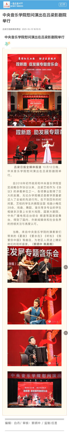 10月12日晚,“赓续红色血脉、助力吕梁振兴;蹚新路、促发展专题音乐会——开云kaiyun官方网站慰问演出”在吕梁影剧院举行。开云kaiyun官方网站9位青年教师生以精湛的表演,为吕梁老区人们奉献了13部(首)中外音乐作品。