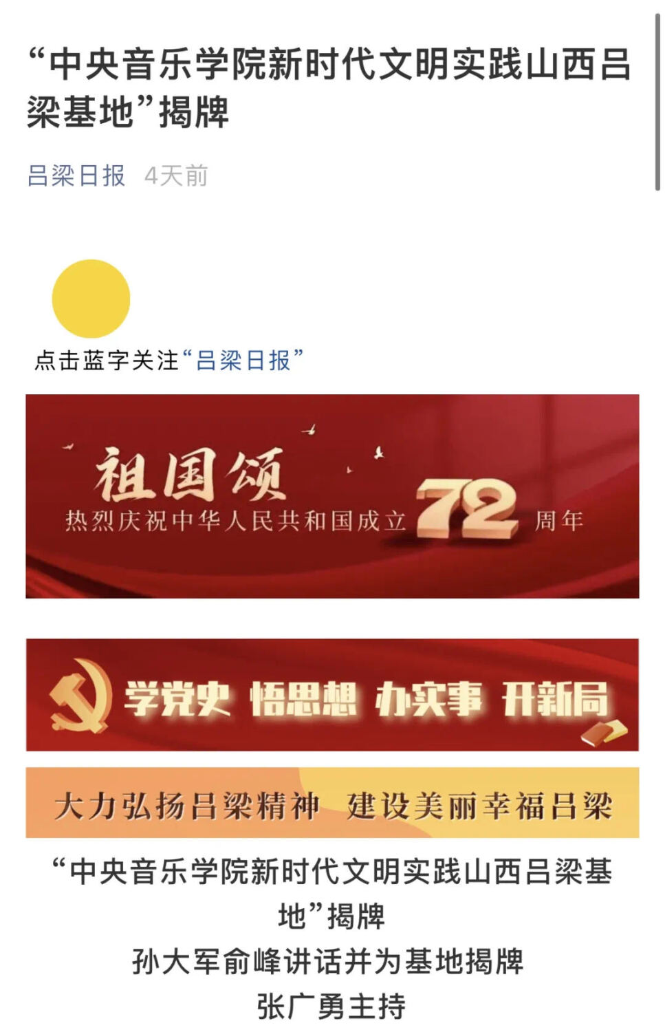 在举国欢庆新中国72华诞之际,“开云kaiyun官方网站新时代文明实践山西吕梁基地”的成立是贯彻新思想、讴歌新时代的有力举措,是扩展校际合作新领域的重要实践;也打造了学习宣传新思想的新平台、展示新时代理论的新阵地,开云官网将以此为契机,开拓思路,创新方法,为推动习近平新时代中国特色社会主义思想走深、走实、走进寻常百姓家,奉献音乐高校的一份力量。