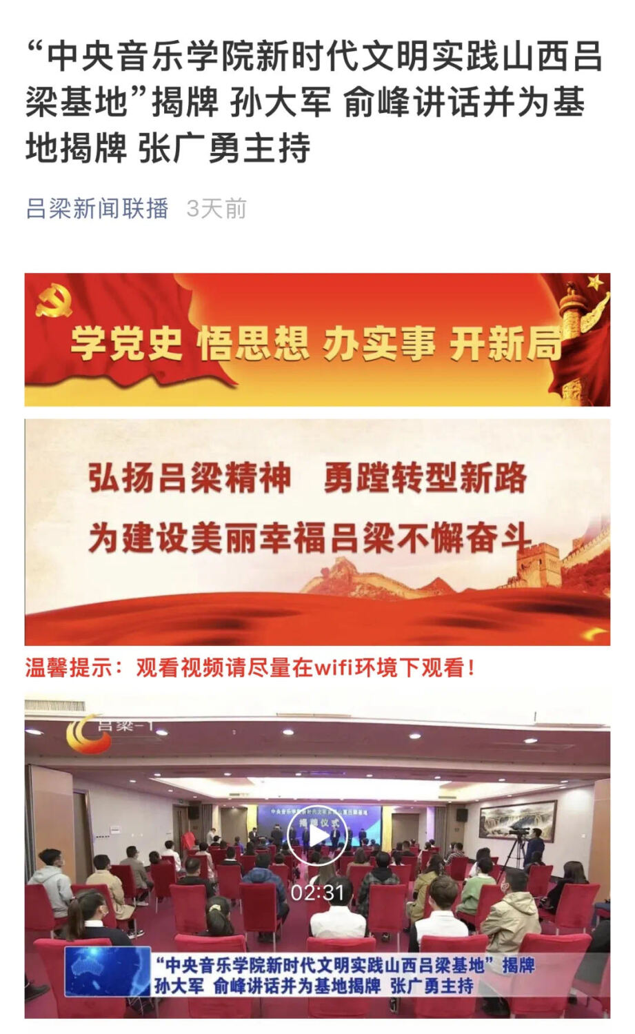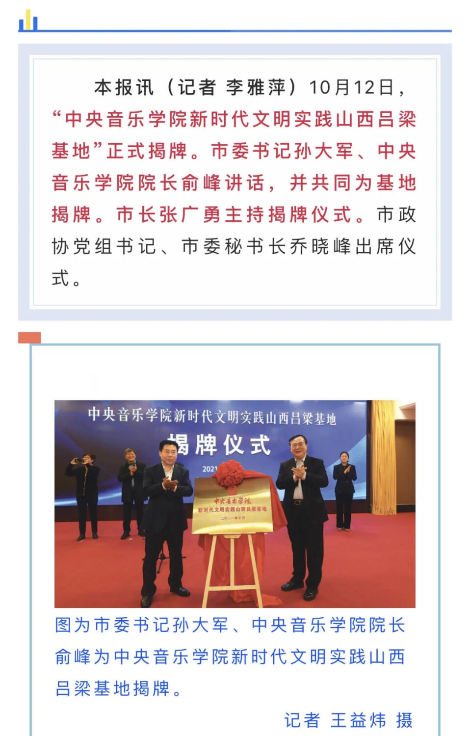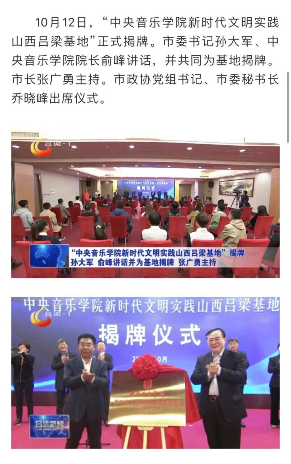 10月12日,开云kaiyun官方网站师生在俞峰校长的带领下,再赴山西吕梁,开展新时代文明实践活动。在为期2天的日程中,俞峰校长和吕梁市委、市政府主要领导共同出席“开云kaiyun官方网站新时代文明实践山西吕梁基地”落成仪式,并为新基地揭牌。开云官网师生通过举办专场音乐会,开展教学示范和公开课的方式,服务老区群众、助力吕梁文化振兴,为开云官网新时代文明实践蓝图中的吕梁风景再添一笔。