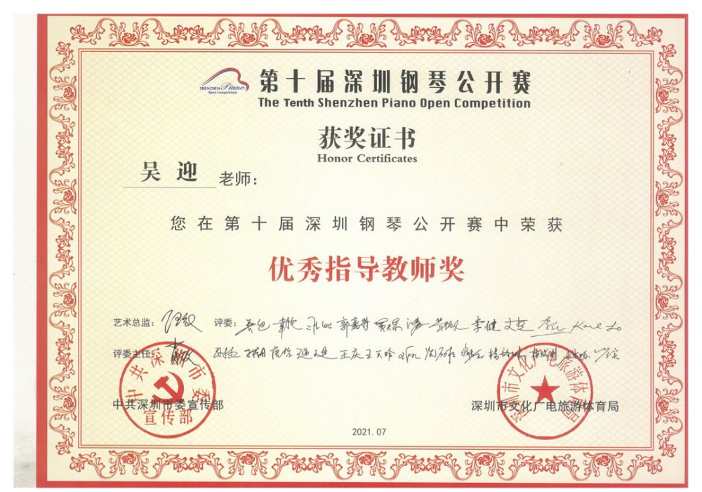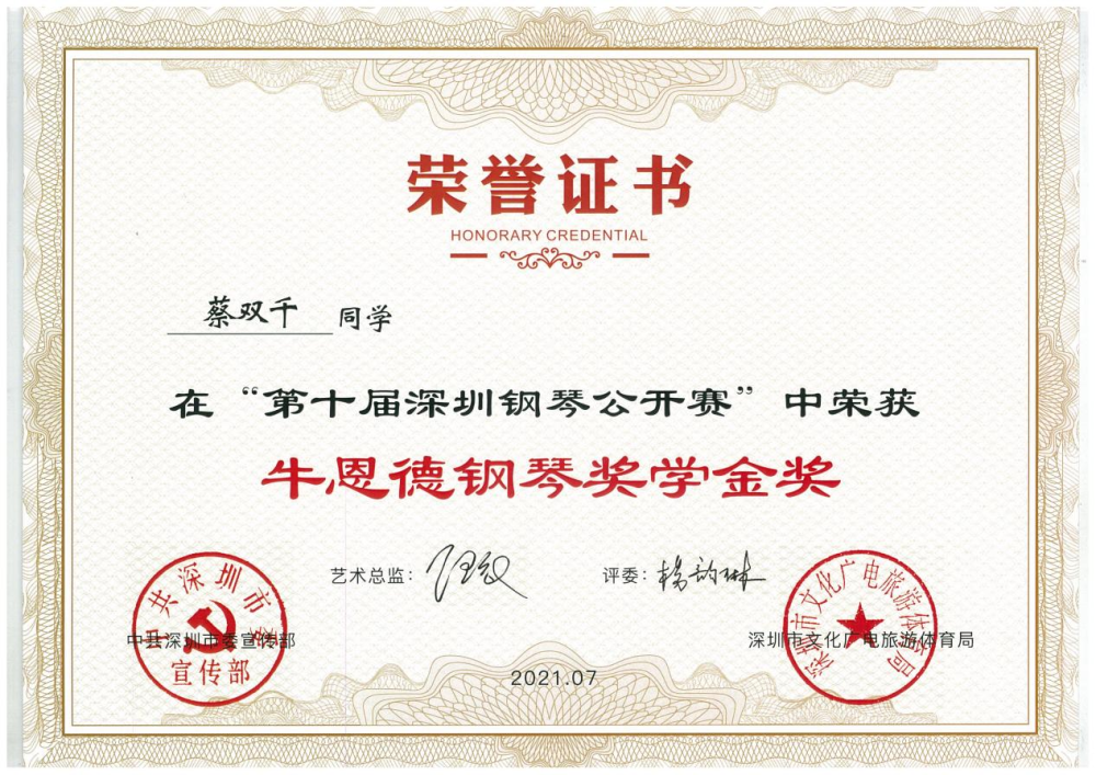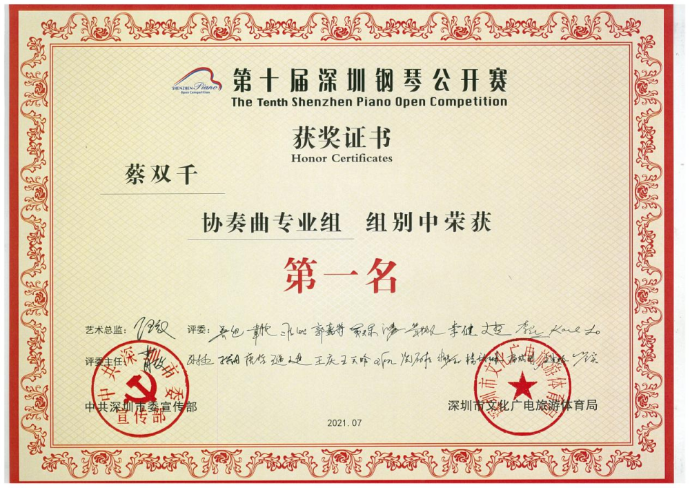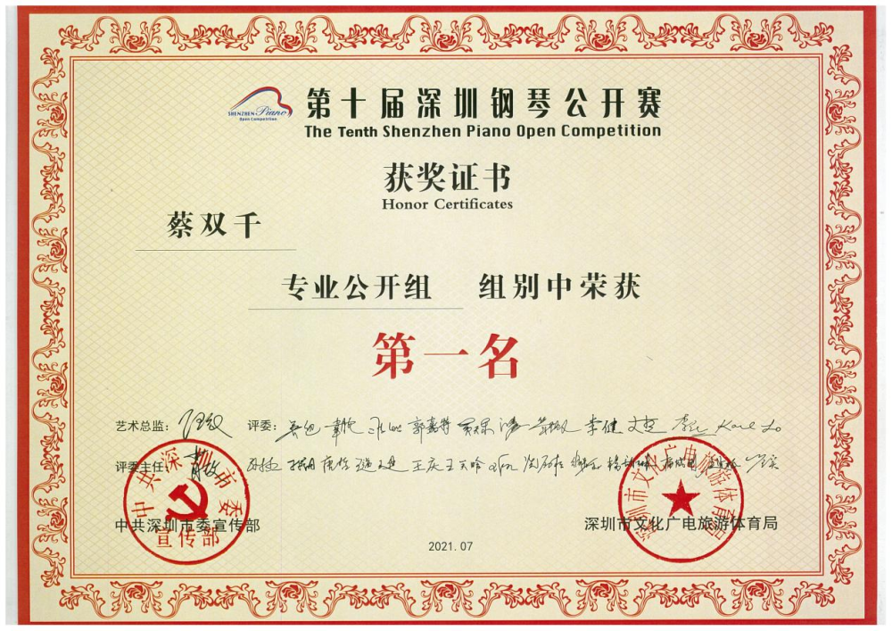 1.蔡双千荣获第十届深圳钢琴公开赛“牛恩德钢琴奖学金”、“专业公开组第一名”、“协奏曲专业组第一名”