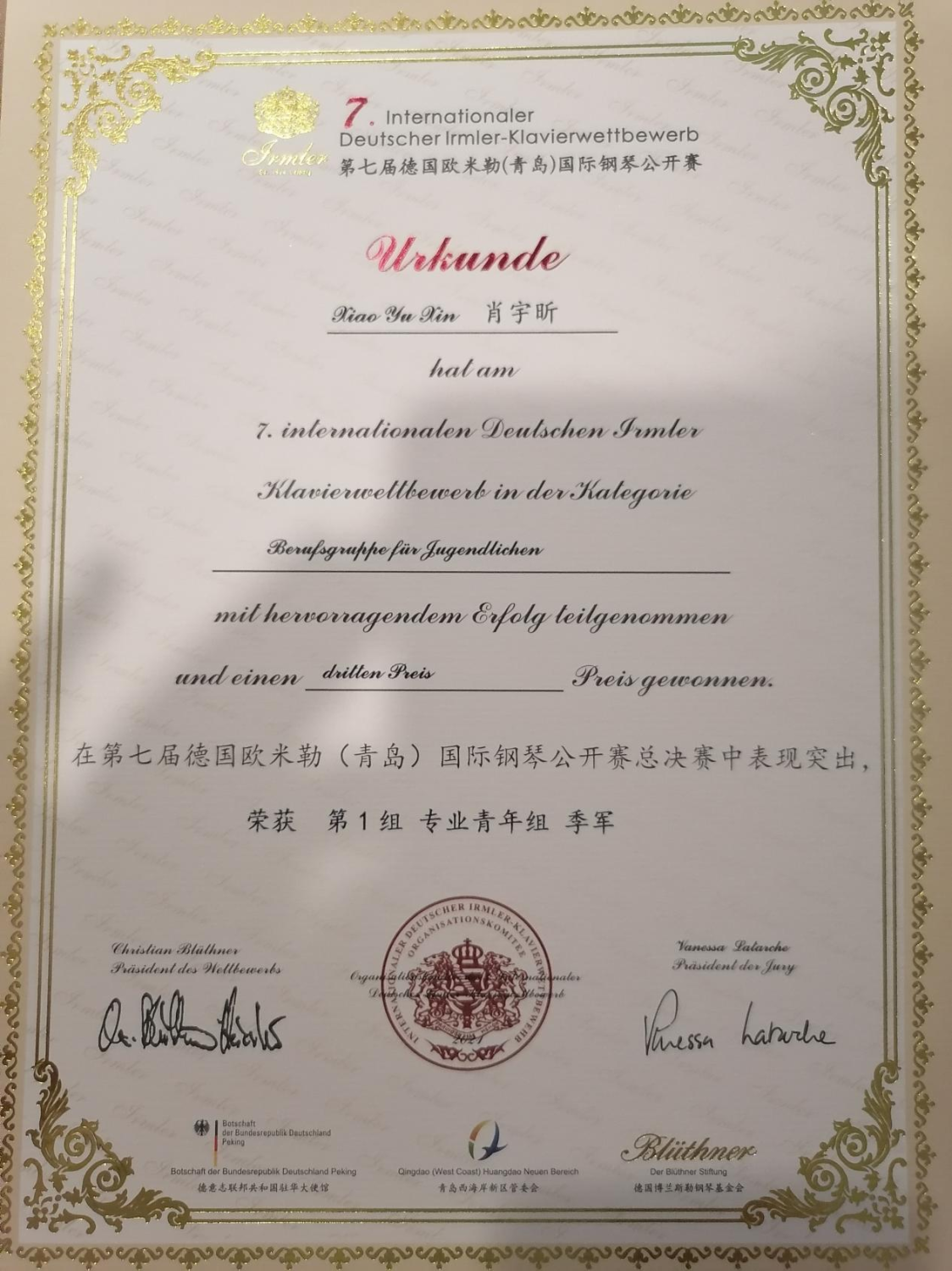 3.肖宇昕荣获第七届德国欧米勒国际钢琴公开赛专业青年组第三名