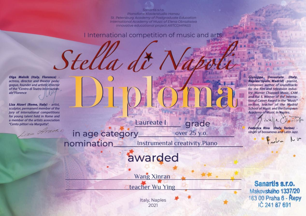 2.王昕然荣获2021年意大利那不勒斯之星国际钢琴比赛第一名