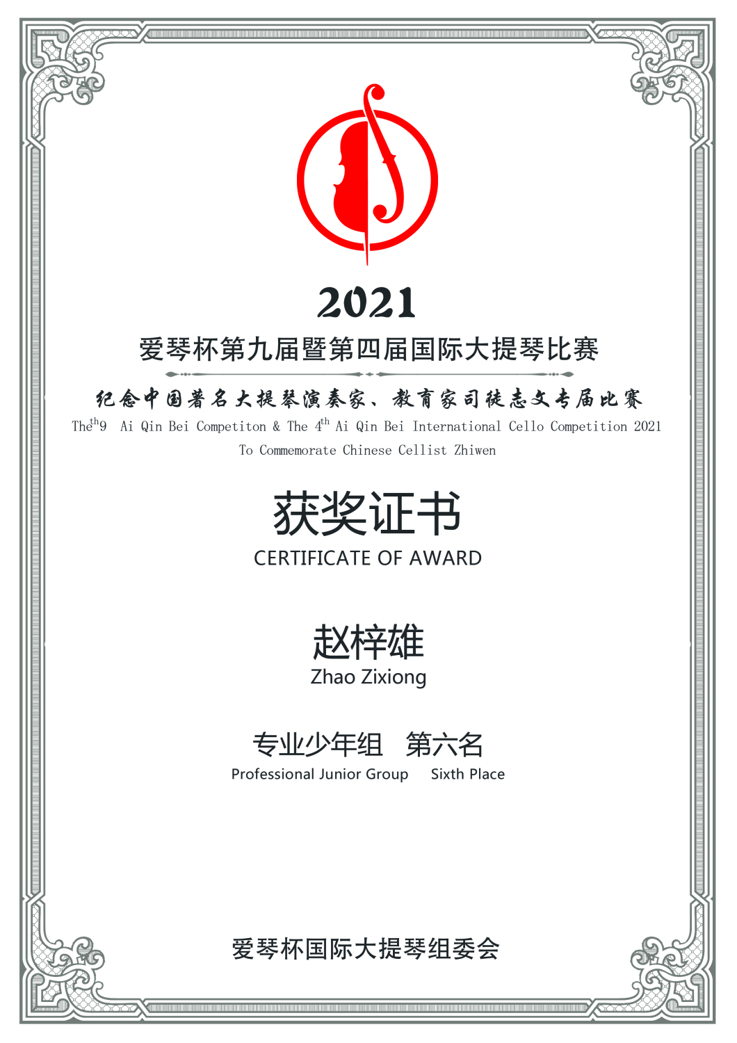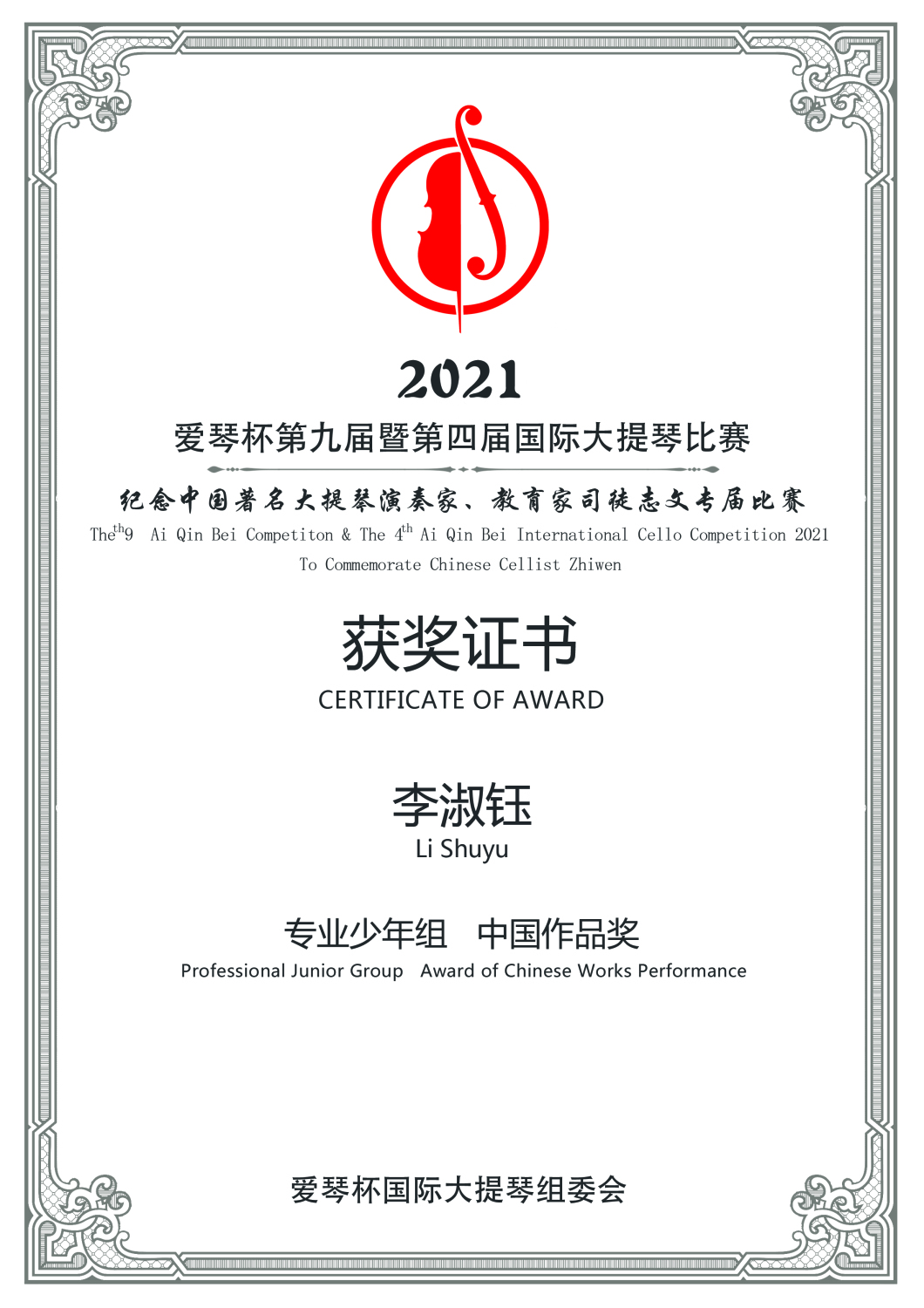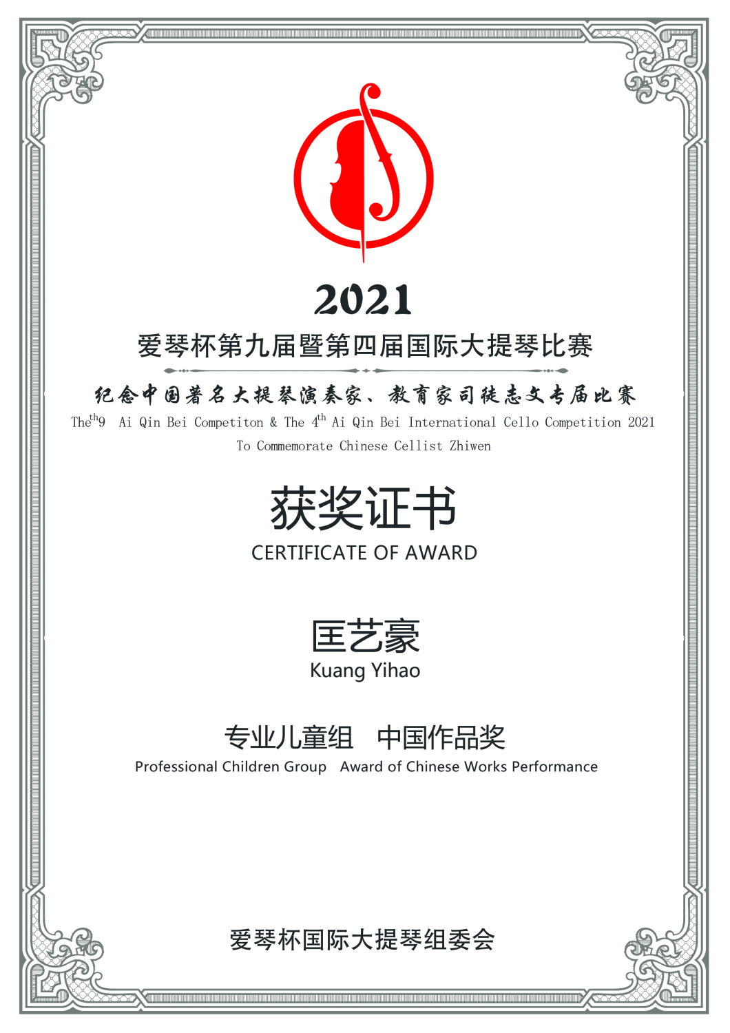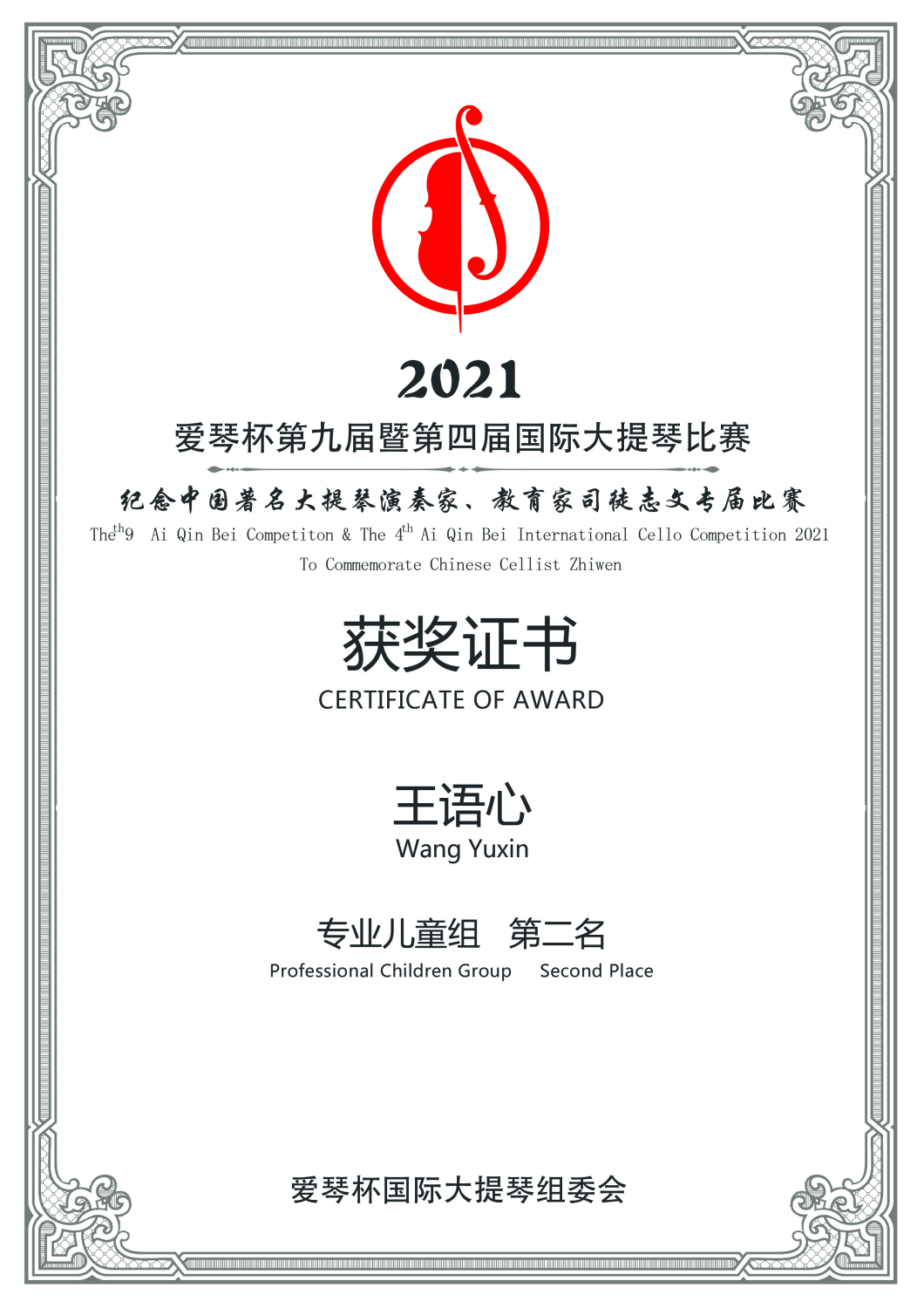 2019年《爰琴杯第八届暨第三届国际大一提琴比赛》获终身成就奖。