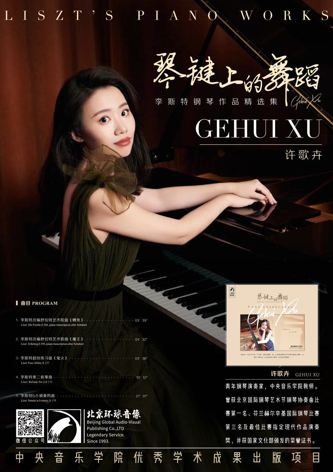 最近,许歌卉女士推出了她的全新个人CD专辑《琴键上的舞蹈——李斯特钢琴作品精选集》,由北京环球音像出版有限公司出版,并独家进行全球数字发行。